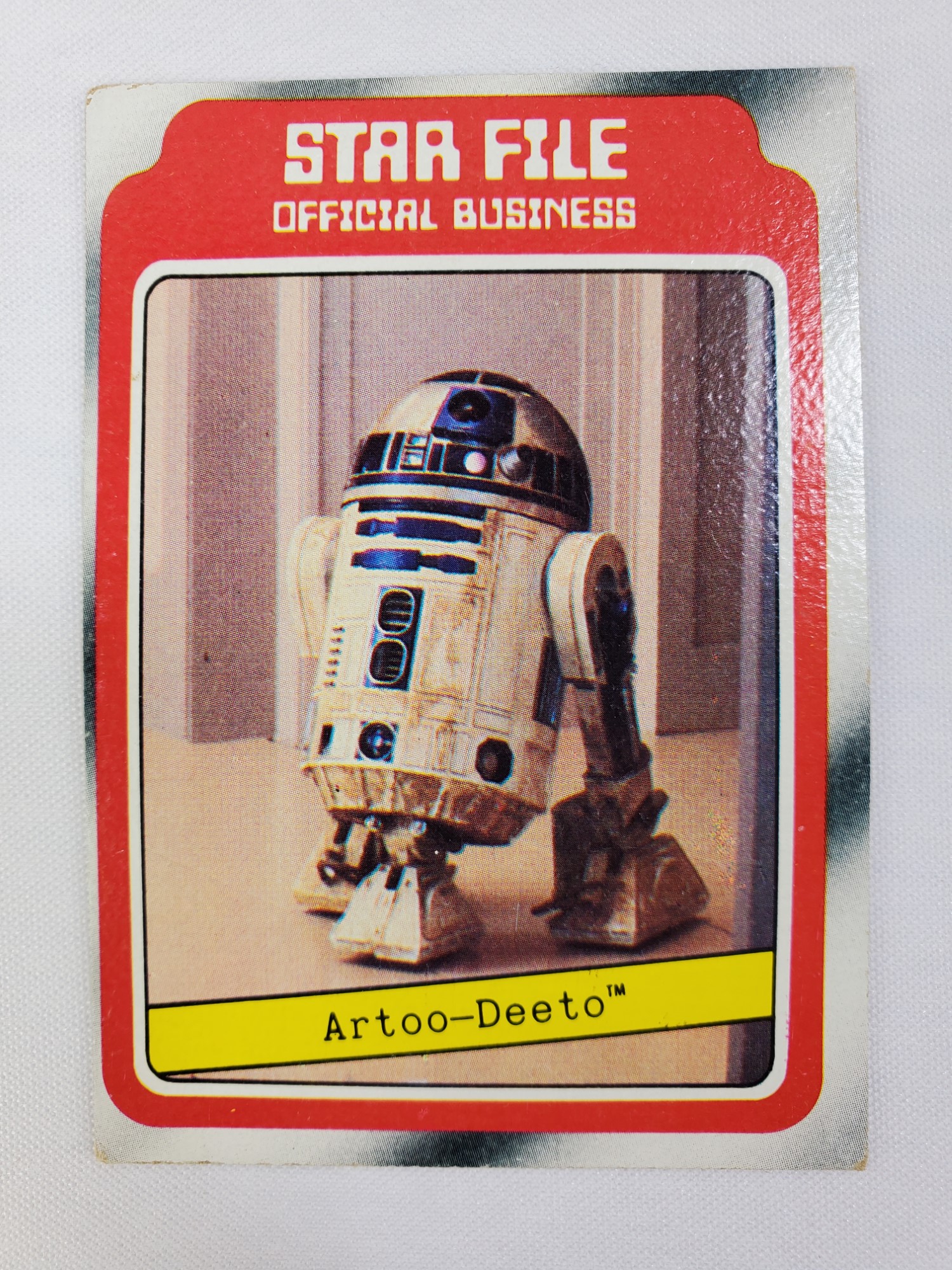 1980 Topps Star Wars: The Empire Strikes Back Series 1 Trading Card #7 – Artoo-Deeto. The Empire Strikes Back Series 1 set is based on Star Wars: Episode V The Empire Strikes Back, and features stills from the film and promotional photos, all within a red and silver border. The first 10 cards are “Star File” character profile cards. The “Story Digest” themed cards tell the story of the movie on the back, and “Space Paintings” cards feature Ralph McQuarrie concept art on the front and “Movie Facts” on the back.