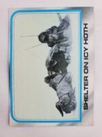 1980 Topps Star Wars: The Empire Strikes Back Series 2 Trading Card #149 – Shelter on Icy Hoth. The Empire Strikes Back Series 2 set is based on Star Wars: Episode V The Empire Strikes Back, and features stills from the film, promotional photos, and behind the scenes photos all within a blue and silver border. The first 10 cards are “Starcraft” vehicle profile cards. The “Star Quiz” themed cards display trivia questions on the back and “Movie Facts” cards include production photos with information on the back.