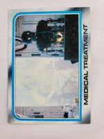 1980 Topps Star Wars: The Empire Strikes Back Series 2 Trading Card #153 – Medical Treatment. The Empire Strikes Back Series 2 set is based on Star Wars: Episode V The Empire Strikes Back, and features stills from the film, promotional photos, and behind the scenes photos all within a blue and silver border. The first 10 cards are “Starcraft” vehicle profile cards. The “Star Quiz” themed cards display trivia questions on the back and “Movie Facts” cards include production photos with information on the back.
