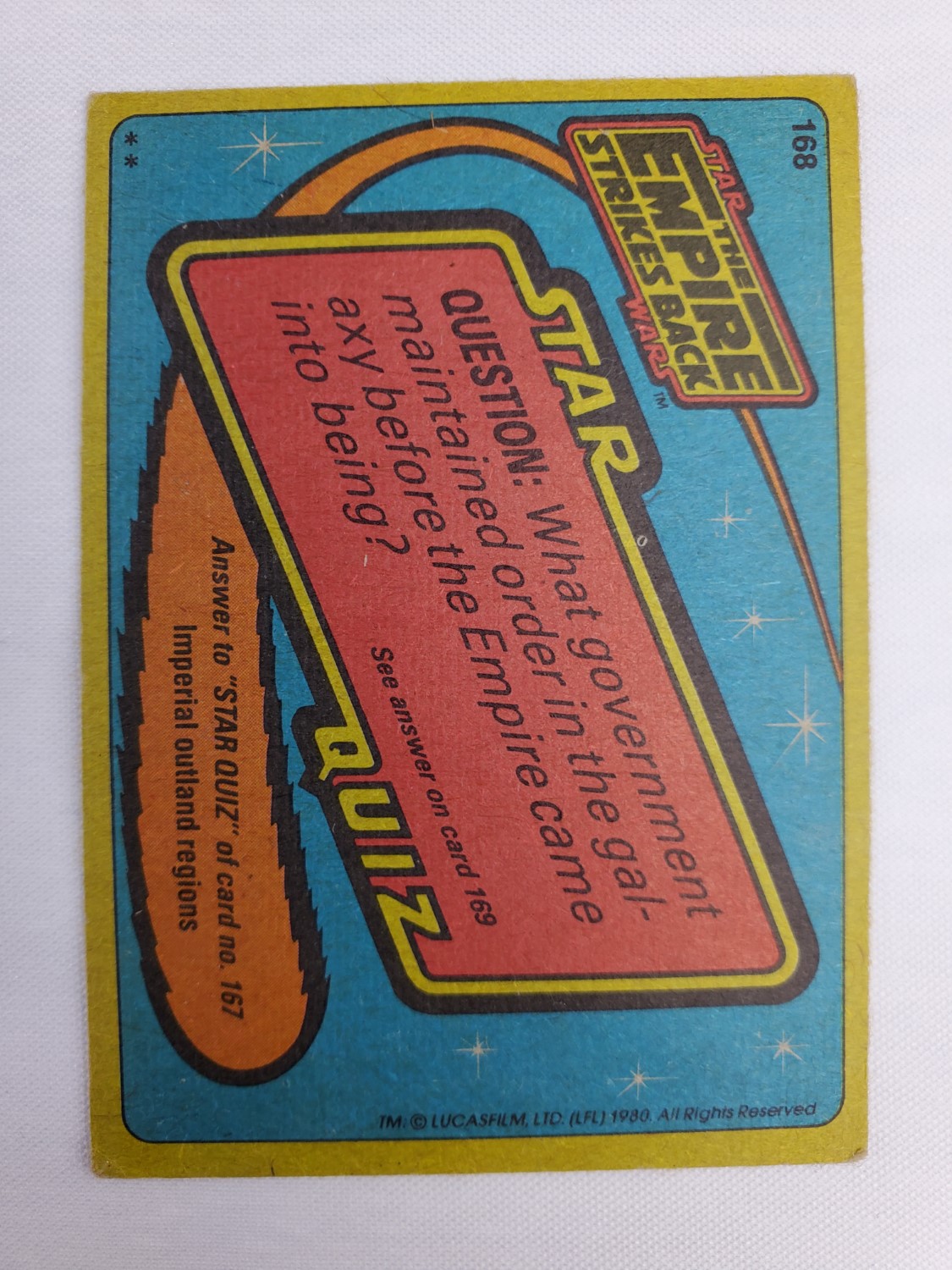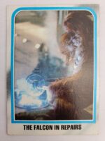 1980 Topps Star Wars: The Empire Strikes Back Series 2 Trading Card #168 – The Falcon in Repairs. The Empire Strikes Back Series 2 set is based on Star Wars: Episode V The Empire Strikes Back, and features stills from the film, promotional photos, and behind the scenes photos all within a blue and silver border. The first 10 cards are “Starcraft” vehicle profile cards. The “Star Quiz” themed cards display trivia questions on the back and “Movie Facts” cards include production photos with information on the back.