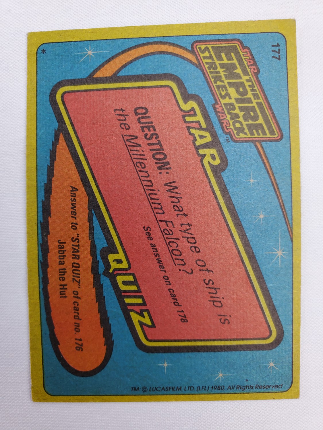 1980 Topps Star Wars: The Empire Strikes Back Series 2 Trading Card #177 – Working Against Time. The Empire Strikes Back Series 2 set is based on Star Wars: Episode V The Empire Strikes Back, and features stills from the film, promotional photos, and behind the scenes photos all within a blue and silver border. The first 10 cards are “Starcraft” vehicle profile cards. The “Star Quiz” themed cards display trivia questions on the back and “Movie Facts” cards include production photos with information on the back.