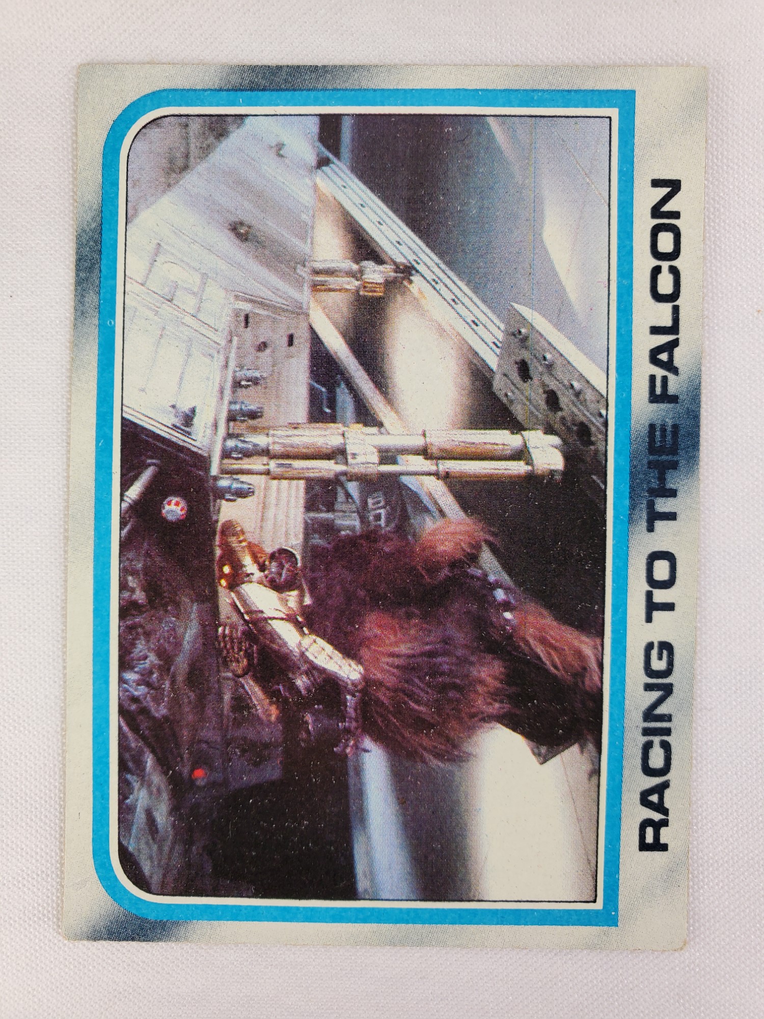 1980 Topps Star Wars: The Empire Strikes Back Series 2 Trading Card #185 – Racing to the Falcon. The Empire Strikes Back Series 2 set is based on Star Wars: Episode V The Empire Strikes Back, and features stills from the film, promotional photos, and behind the scenes photos all within a blue and silver border. The first 10 cards are “Starcraft” vehicle profile cards. The “Star Quiz” themed cards display trivia questions on the back and “Movie Facts” cards include production photos with information on the back.
