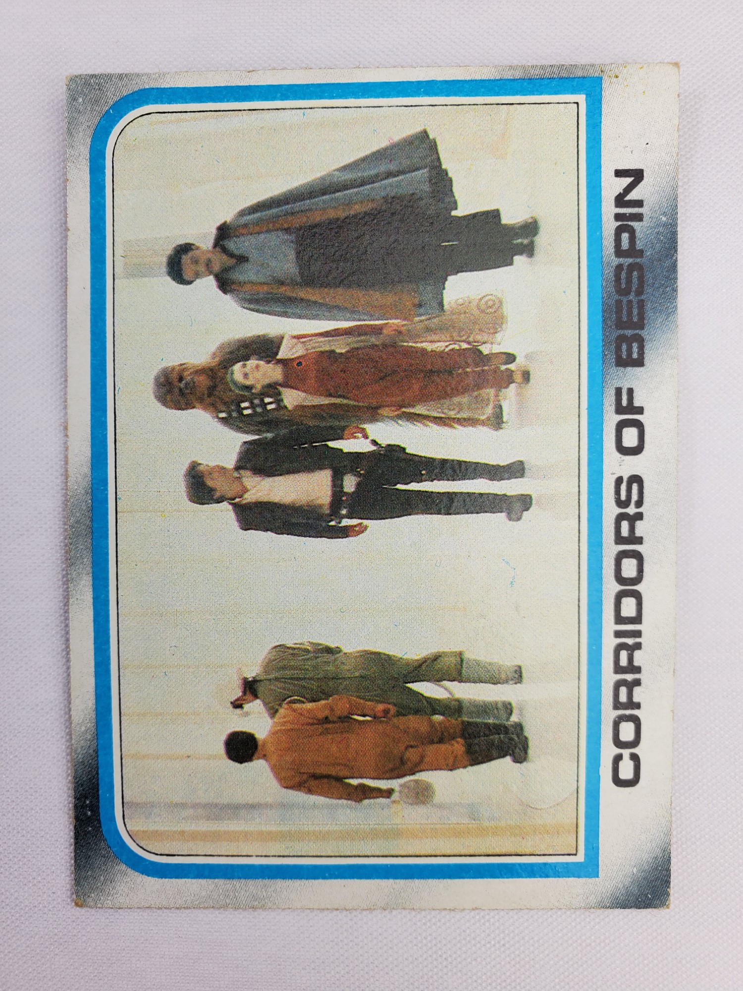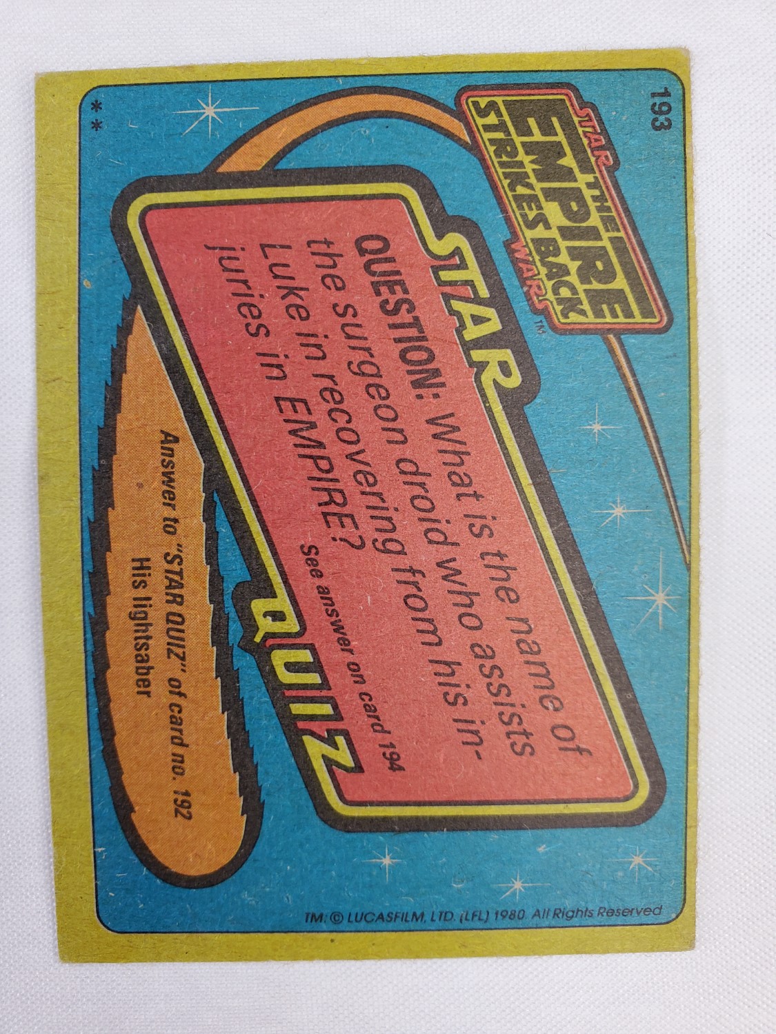 1980 Topps Star Wars: The Empire Strikes Back Series 2 Trading Card #193 – Corridors of Bespin. The Empire Strikes Back Series 2 set is based on Star Wars: Episode V The Empire Strikes Back, and features stills from the film, promotional photos, and behind the scenes photos all within a blue and silver border. The first 10 cards are “Starcraft” vehicle profile cards. The “Star Quiz” themed cards display trivia questions on the back and “Movie Facts” cards include production photos with information on the back.