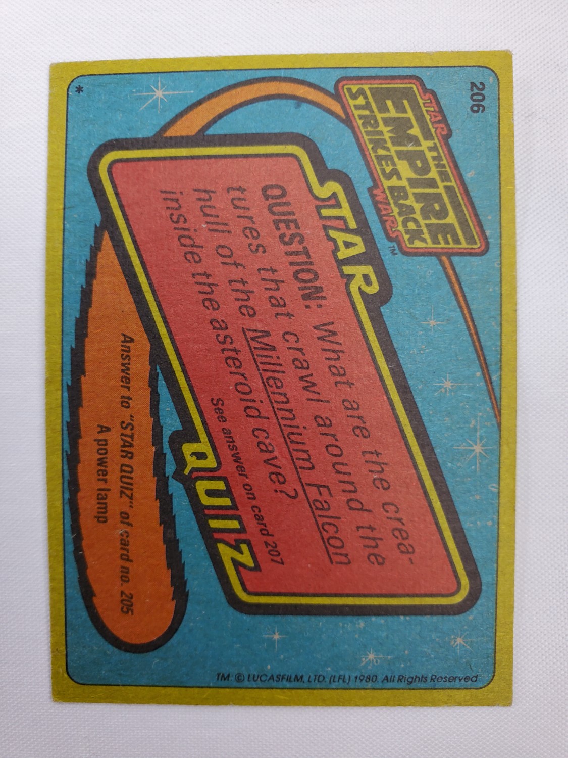 1980 Topps Star Wars: The Empire Strikes Back Series 2 Trading Card #206 – Suspended in Carbon Freeze. The Empire Strikes Back Series 2 set is based on Star Wars: Episode V The Empire Strikes Back, and features stills from the film, promotional photos, and behind the scenes photos all within a blue and silver border. The first 10 cards are “Starcraft” vehicle profile cards. The “Star Quiz” themed cards display trivia questions on the back and “Movie Facts” cards include production photos with information on the back.