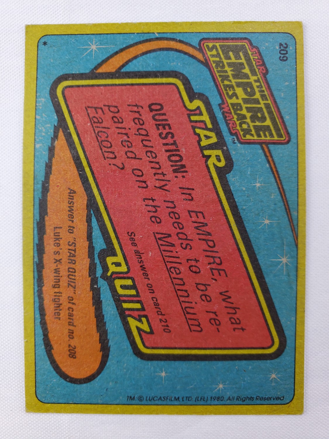 1980 Topps Star Wars: The Empire Strikes Back Series 2 Trading Card #209 – This Deal Is Getting Worse! The Empire Strikes Back Series 2 set is based on Star Wars: Episode V The Empire Strikes Back, and features stills from the film, promotional photos, and behind the scenes photos all within a blue and silver border. The first 10 cards are “Starcraft” vehicle profile cards. The “Star Quiz” themed cards display trivia questions on the back and “Movie Facts” cards include production photos with information on the back.