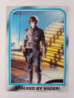 1980 Topps Star Wars: The Empire Strikes Back Series 2 Trading Card #215 – Stalked by Vader! The Empire Strikes Back Series 2 set is based on Star Wars: Episode V The Empire Strikes Back, and features stills from the film, promotional photos, and behind the scenes photos all within a blue and silver border. The first 10 cards are “Starcraft” vehicle profile cards. The “Star Quiz” themed cards display trivia questions on the back and “Movie Facts” cards include production photos with information on the back.