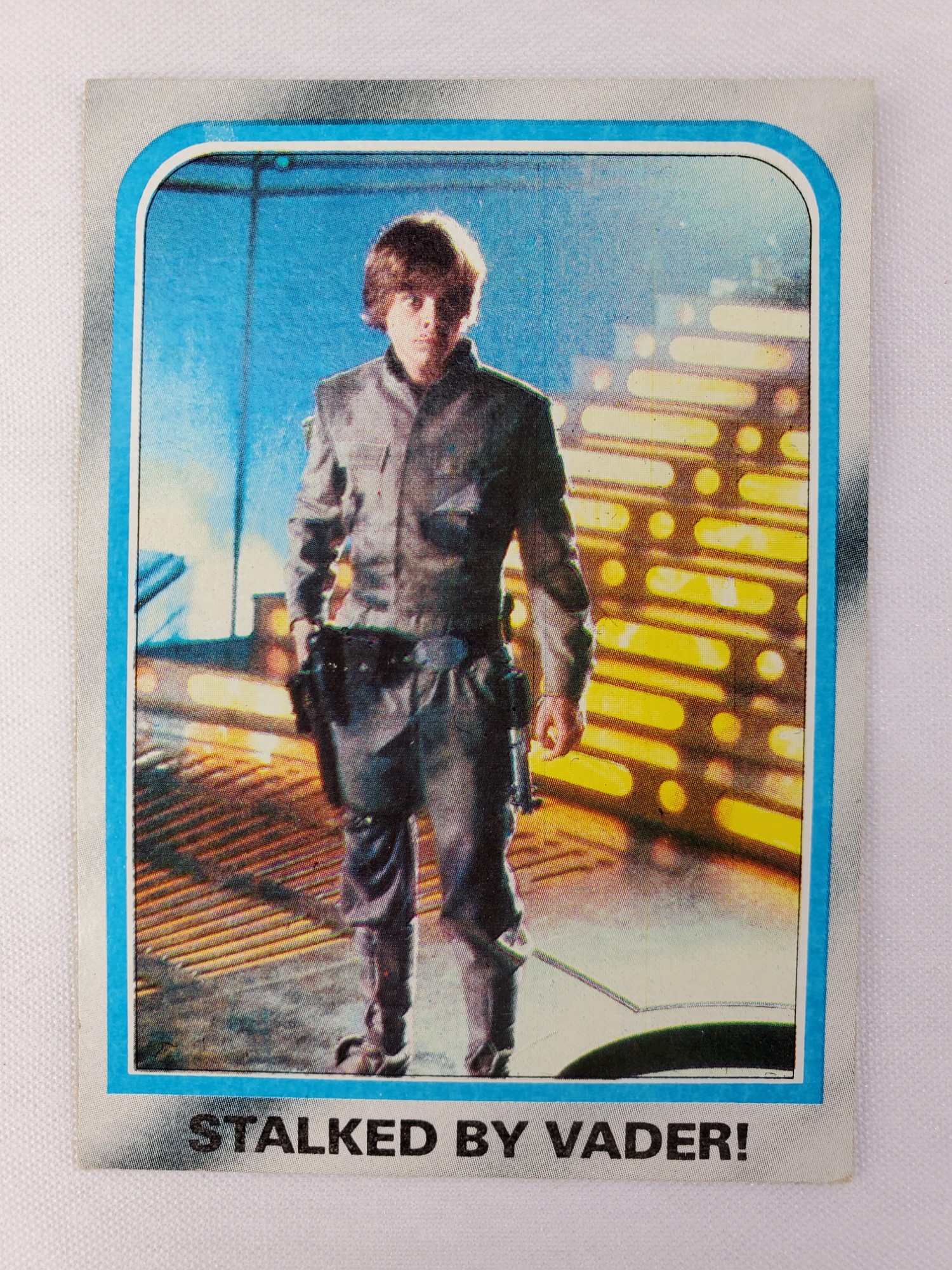 1980 Topps Star Wars: The Empire Strikes Back Series 2 Trading Card #215 – Stalked by Vader! The Empire Strikes Back Series 2 set is based on Star Wars: Episode V The Empire Strikes Back, and features stills from the film, promotional photos, and behind the scenes photos all within a blue and silver border. The first 10 cards are “Starcraft” vehicle profile cards. The “Star Quiz” themed cards display trivia questions on the back and “Movie Facts” cards include production photos with information on the back.