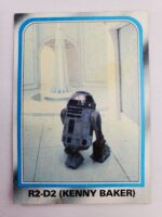 1980 Topps Star Wars: The Empire Strikes Back Series 2 Trading Card #229 – R2-D2 (Kenny Baker). The Empire Strikes Back Series 2 set is based on Star Wars: Episode V The Empire Strikes Back, and features stills from the film, promotional photos, and behind the scenes photos all within a blue and silver border. The first 10 cards are “Starcraft” vehicle profile cards. The “Star Quiz” themed cards display trivia questions on the back and “Movie Facts” cards include production photos with information on the back.