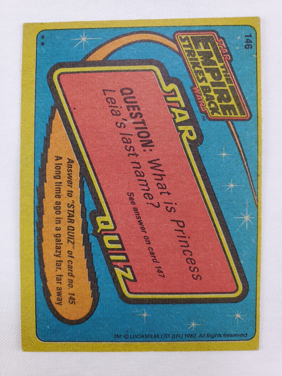 1980 Topps Star Wars: The Empire Strikes Back Series 2 Trading Card #146 – The Searcher. The Empire Strikes Back Series 2 set is based on Star Wars: Episode V The Empire Strikes Back, and features stills from the film, promotional photos, and behind the scenes photos all within a blue and silver border. The first 10 cards are “Starcraft” vehicle profile cards. The “Star Quiz” themed cards display trivia questions on the back and “Movie Facts” cards include production photos with information on the back.