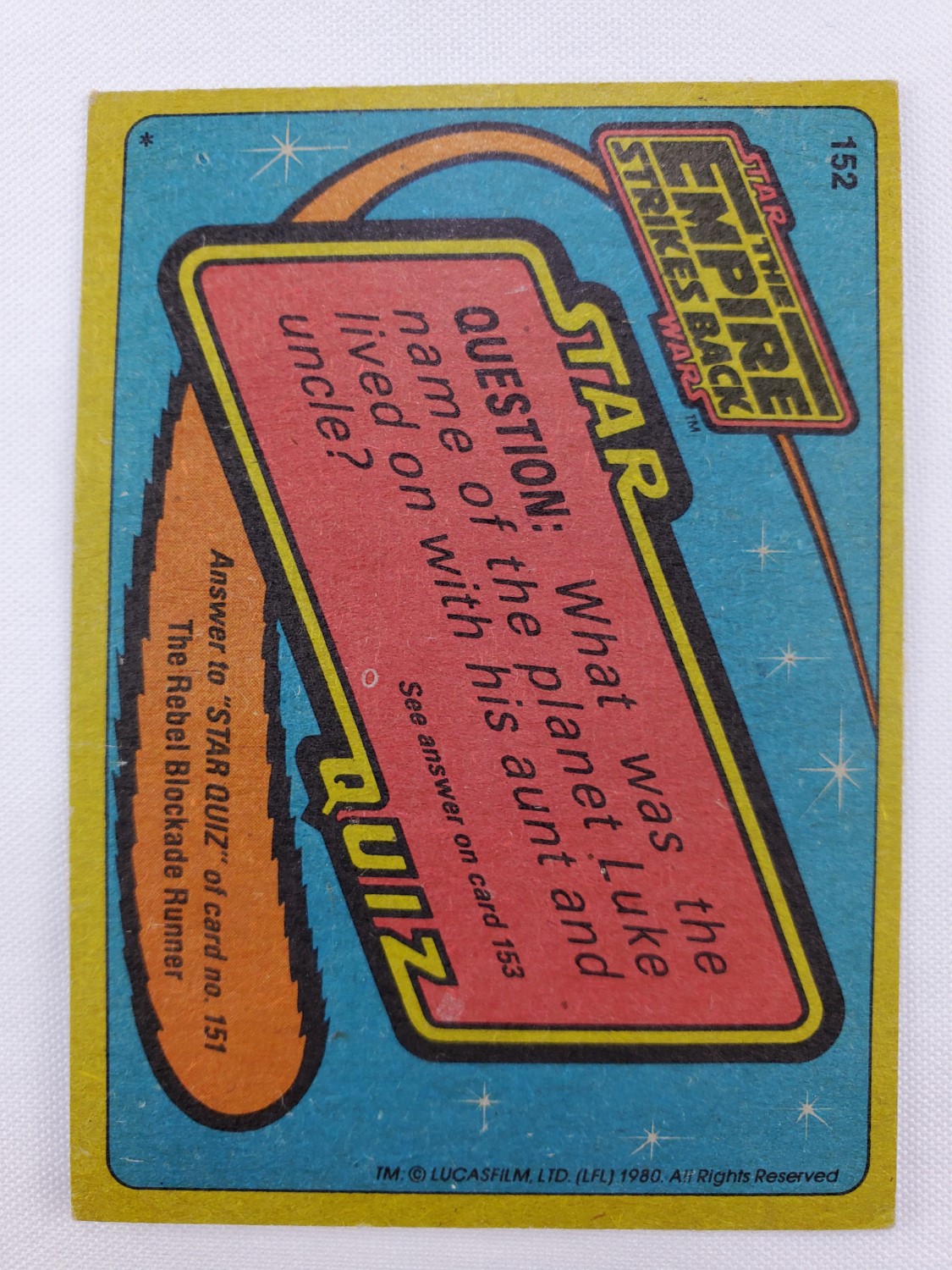 1980 Topps Star Wars: The Empire Strikes Back Series 2 Trading Card #152 – Han Solo Rescuer. The Empire Strikes Back Series 2 set is based on Star Wars: Episode V The Empire Strikes Back, and features stills from the film, promotional photos, and behind the scenes photos all within a blue and silver border. The first 10 cards are “Starcraft” vehicle profile cards. The “Star Quiz” themed cards display trivia questions on the back and “Movie Facts” cards include production photos with information on the back.