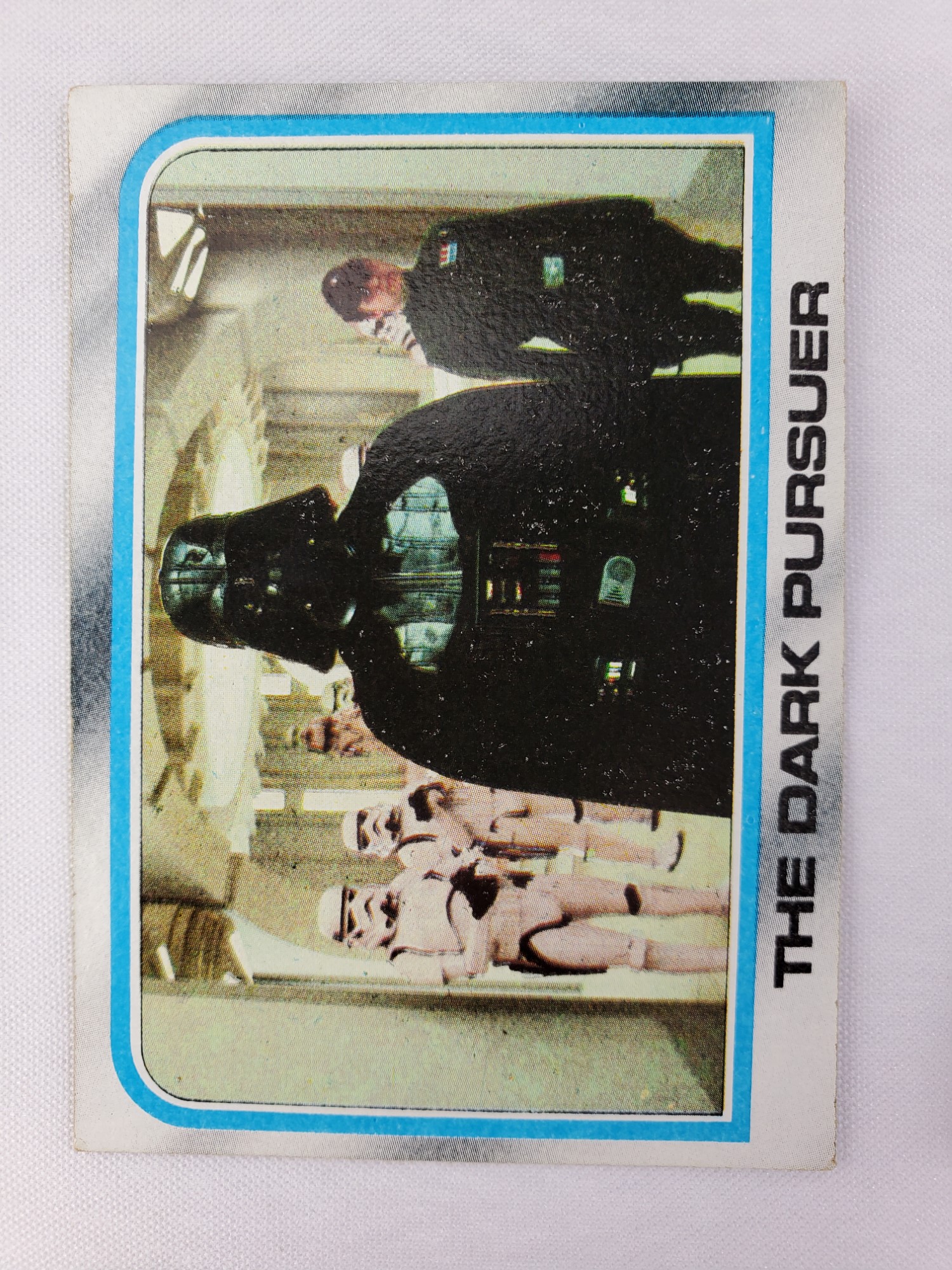 1980 Topps Star Wars: The Empire Strikes Back Series 2 Trading Card #187 – The Dark Pursuer. The Empire Strikes Back Series 2 set is based on Star Wars: Episode V The Empire Strikes Back, and features stills from the film, promotional photos, and behind the scenes photos all within a blue and silver border. The first 10 cards are “Starcraft” vehicle profile cards. The “Star Quiz” themed cards display trivia questions on the back and “Movie Facts” cards include production photos with information on the back.