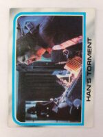 1980 Topps Star Wars: The Empire Strikes Back Series 2 Trading Card #197 – Han’s Torment. The Empire Strikes Back Series 2 set is based on Star Wars: Episode V The Empire Strikes Back, and features stills from the film, promotional photos, and behind the scenes photos all within a blue and silver border. The first 10 cards are “Starcraft” vehicle profile cards. The “Star Quiz” themed cards display trivia questions on the back and “Movie Facts” cards include production photos with information on the back.