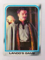 1980 Topps Star Wars: The Empire Strikes Back Series 2 Trading Card #198 – Lando’s Game. The Empire Strikes Back Series 2 set is based on Star Wars: Episode V The Empire Strikes Back, and features stills from the film, promotional photos, and behind the scenes photos all within a blue and silver border. The first 10 cards are “Starcraft” vehicle profile cards. The “Star Quiz” themed cards display trivia questions on the back and “Movie Facts” cards include production photos with information on the back.