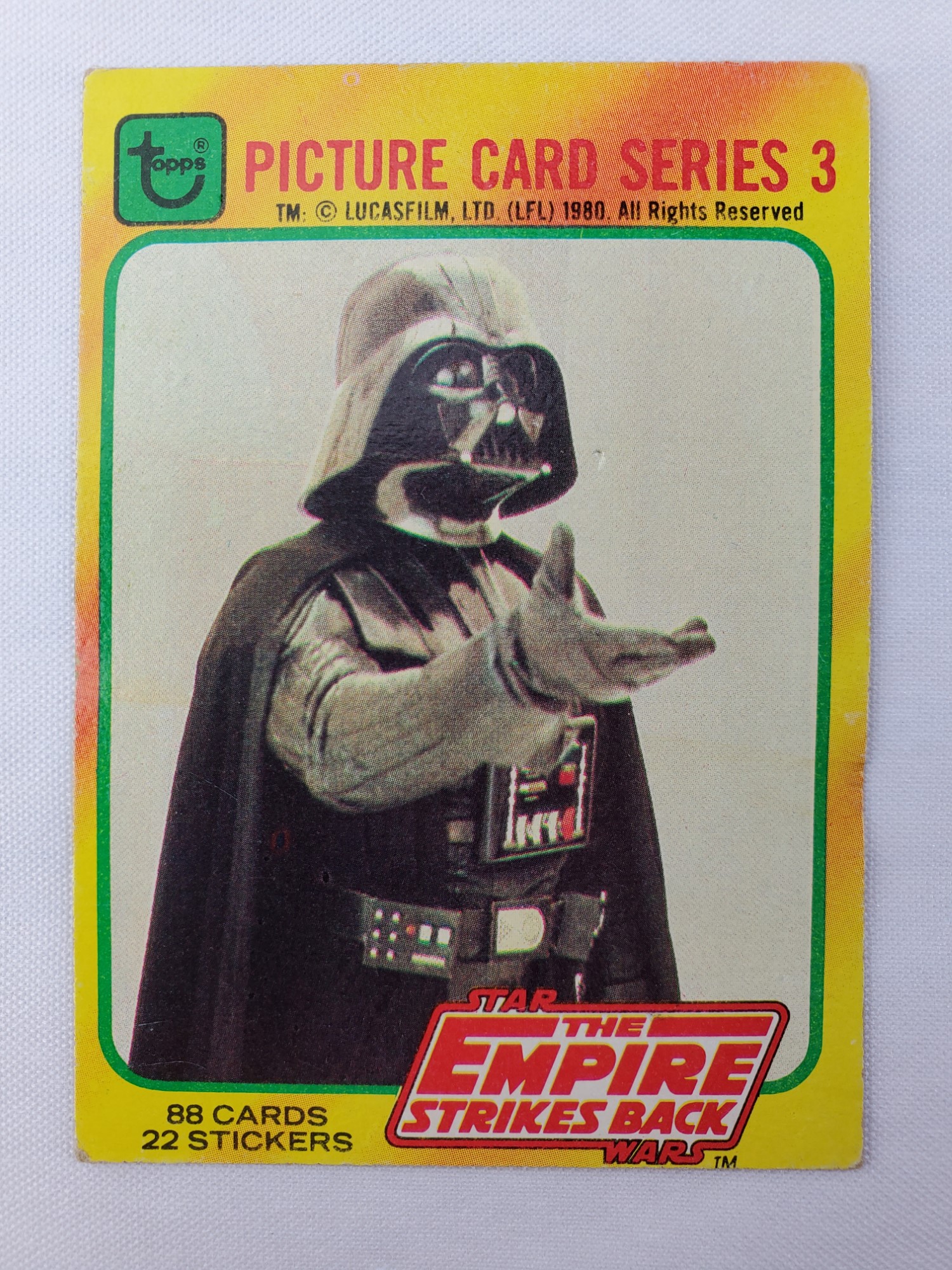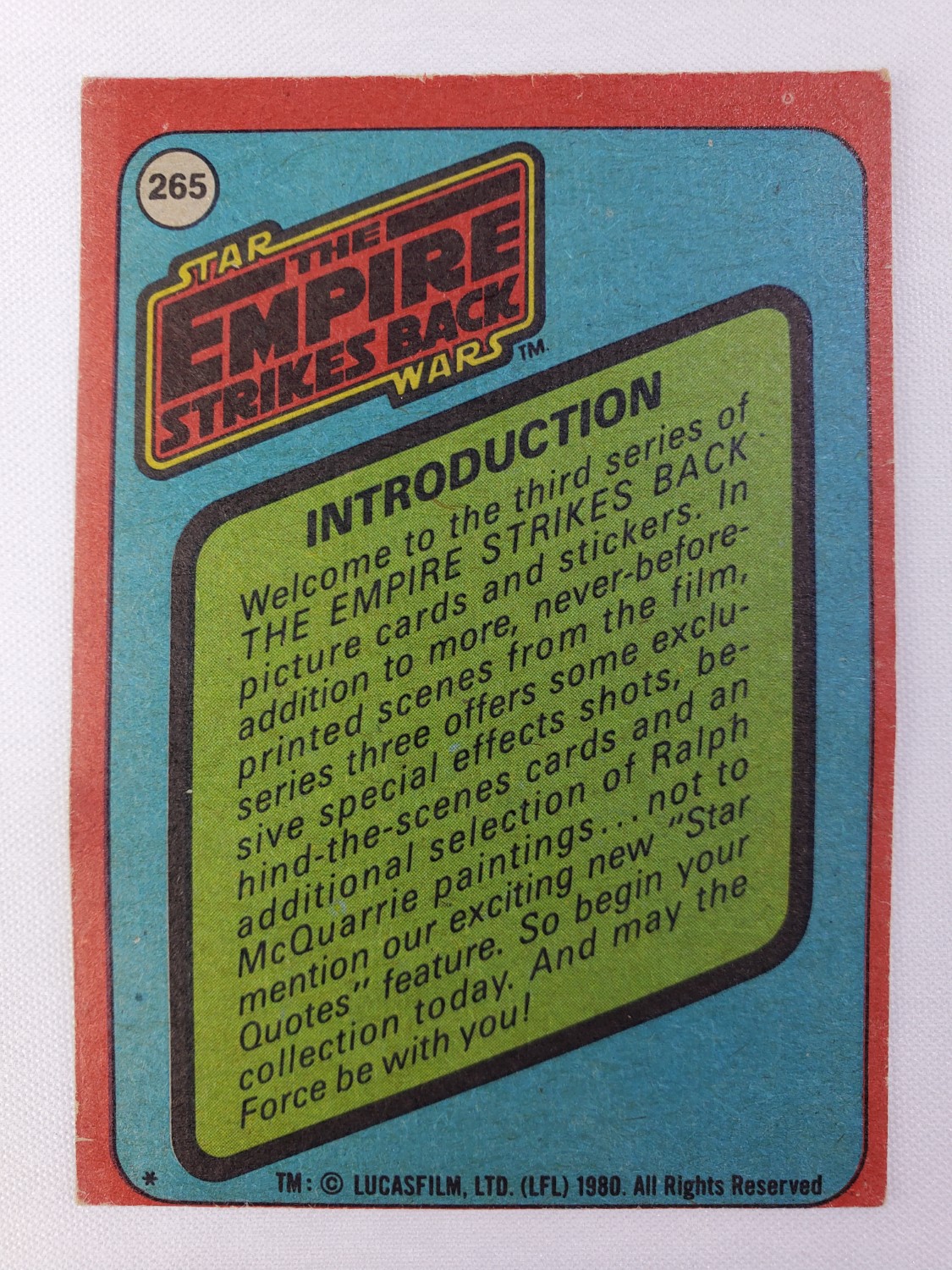 1980 Topps Star Wars: The Empire Strikes Back Series 3 Trading Card #265 – Picture Card Ser. 3. The Empire Strikes Back Series 3 set is based on Star Wars: Episode V The Empire Strikes Back, and features stills from the film, promotional photos, and behind the scenes photos all within a yellow and green border. Most cards have “Star Quotes” on the back with dialogue from both films in the series. “Space Paintings” cards feature concept art by Ralph McQuarrie, and “Movie Facts” cards include production photos on the front and information on the back.