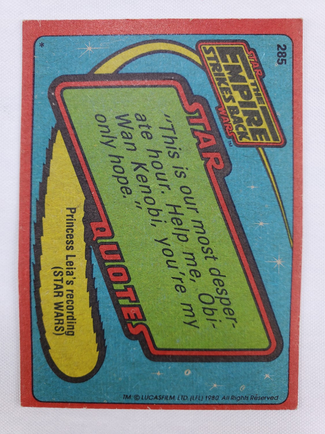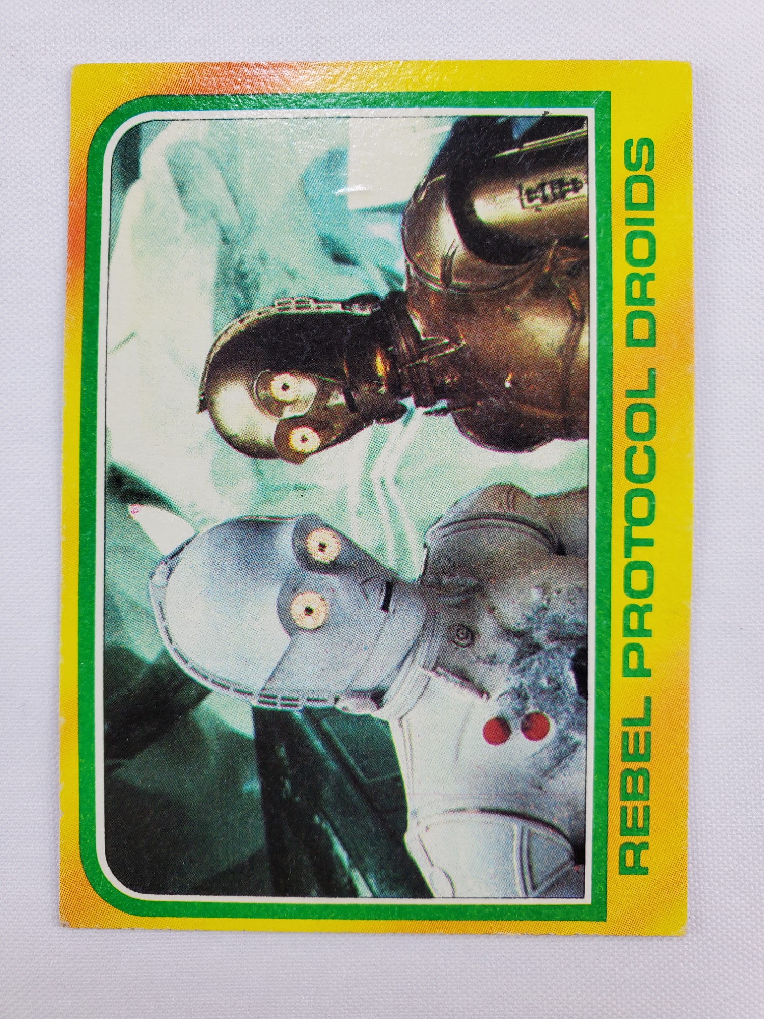 1980 Topps Star Wars: The Empire Strikes Back Series 3 Trading Card #285 – Rebel Protocol Droids. The Empire Strikes Back Series 3 set is based on Star Wars: Episode V The Empire Strikes Back, and features stills from the film, promotional photos, and behind the scenes photos all within a yellow and green border. Most cards have “Star Quotes” on the back with dialogue from both films in the series. “Space Paintings” cards feature concept art by Ralph McQuarrie, and “Movie Facts” cards include production photos on the front and information on the back.