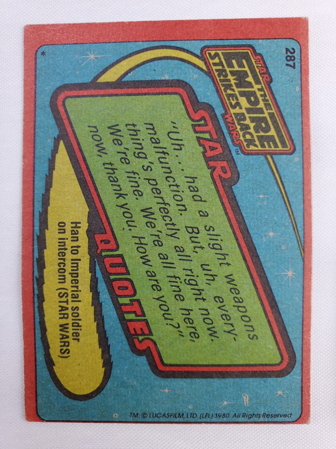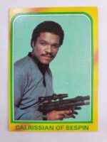 1980 Topps Star Wars: The Empire Strikes Back Series 3 Trading Card #287 – Calrissian of Bespin. The Empire Strikes Back Series 3 set is based on Star Wars: Episode V The Empire Strikes Back, and features stills from the film, promotional photos, and behind the scenes photos all within a yellow and green border. Most cards have “Star Quotes” on the back with dialogue from both films in the series. “Space Paintings” cards feature concept art by Ralph McQuarrie, and “Movie Facts” cards include production photos on the front and information on the back.