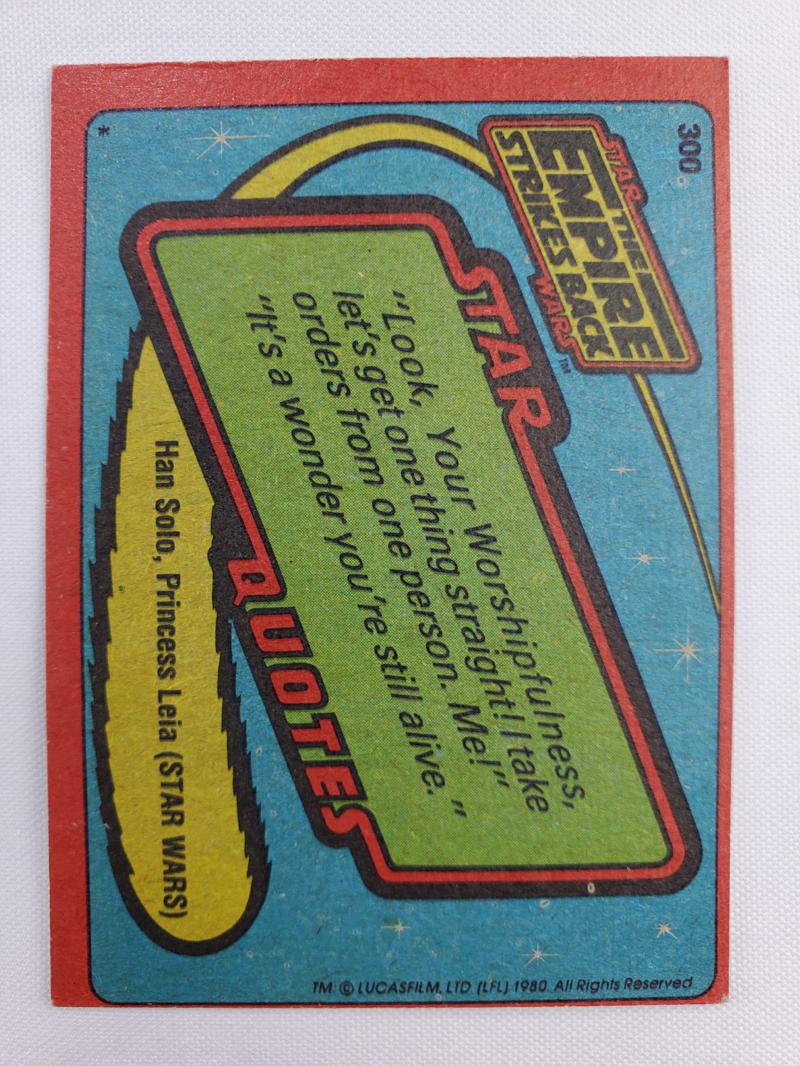 1980 Topps Star Wars: The Empire Strikes Back Series 3 Trading Card #300 – Descent into Danger. The Empire Strikes Back Series 3 set is based on Star Wars: Episode V The Empire Strikes Back, and features stills from the film, promotional photos, and behind the scenes photos all within a yellow and green border. Most cards have “Star Quotes” on the back with dialogue from both films in the series. “Space Paintings” cards feature concept art by Ralph McQuarrie, and “Movie Facts” cards include production photos on the front and information on the back.