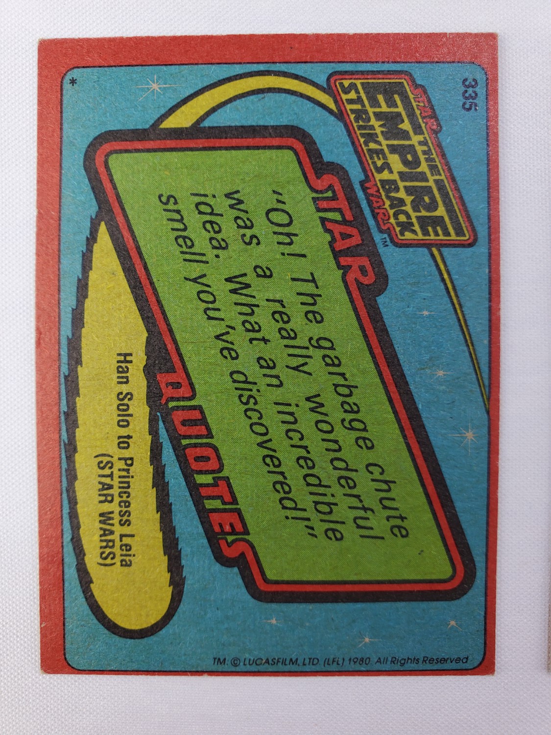 1980 Topps Star Wars: The Empire Strikes Back Series 3 Trading Card #335 – Approaching Planet Dagobah. The Empire Strikes Back Series 3 set is based on Star Wars: Episode V The Empire Strikes Back, and features stills from the film, promotional photos, and behind the scenes photos all within a yellow and green border. Most cards have “Star Quotes” on the back with dialogue from both films in the series. “Space Paintings” cards feature concept art by Ralph McQuarrie, and “Movie Facts” cards include production photos on the front and information on the back.