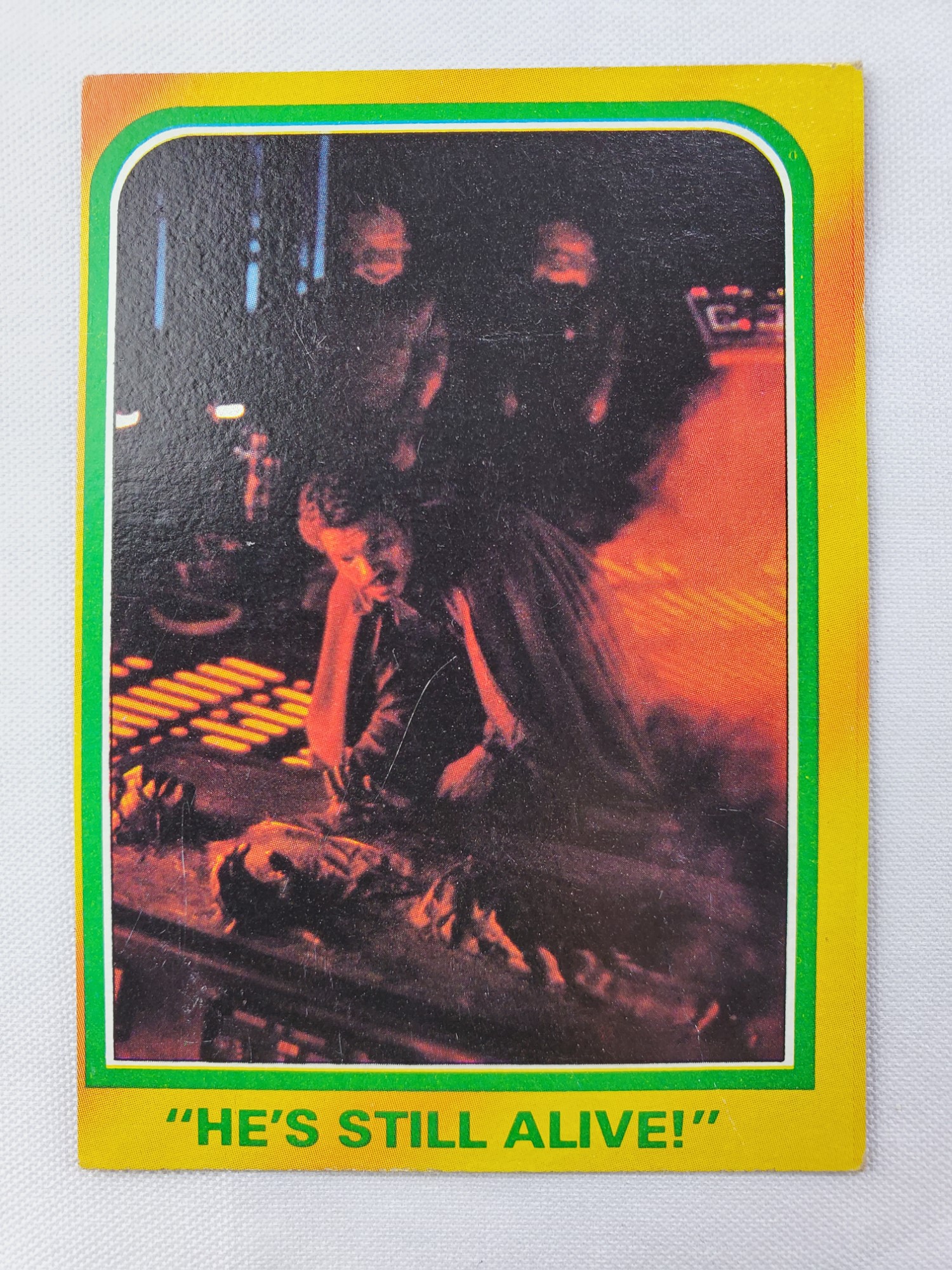 1980 Topps Star Wars: The Empire Strikes Back Series 3 Trading Card #320 – He’s Still Alive! The Empire Strikes Back Series 3 set is based on Star Wars: Episode V The Empire Strikes Back, and features stills from the film, promotional photos, and behind the scenes photos all within a yellow and green border. Most cards have “Star Quotes” on the back with dialogue from both films in the series. “Space Paintings” cards feature concept art by Ralph McQuarrie, and “Movie Facts” cards include production photos on the front and information on the back.