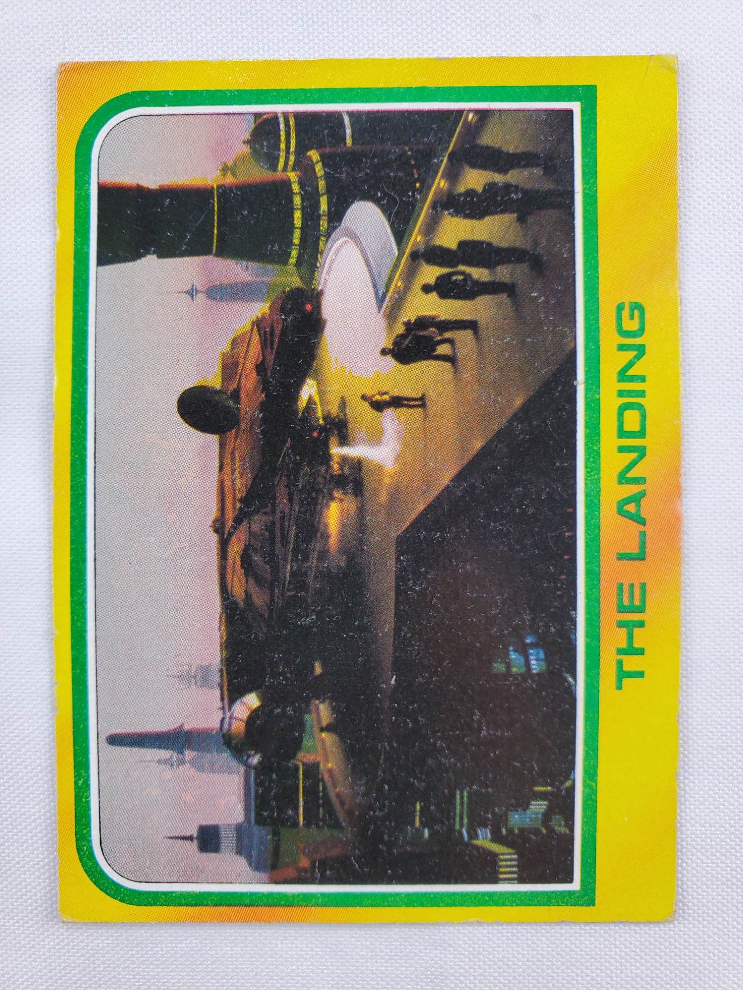 1980 Topps Star Wars: The Empire Strikes Back Series 3 Trading Card #322 – The Landing. The Empire Strikes Back Series 3 set is based on Star Wars: Episode V The Empire Strikes Back, and features stills from the film, promotional photos, and behind the scenes photos all within a yellow and green border. Most cards have “Star Quotes” on the back with dialogue from both films in the series. “Space Paintings” cards feature concept art by Ralph McQuarrie, and “Movie Facts” cards include production photos on the front and information on the back.