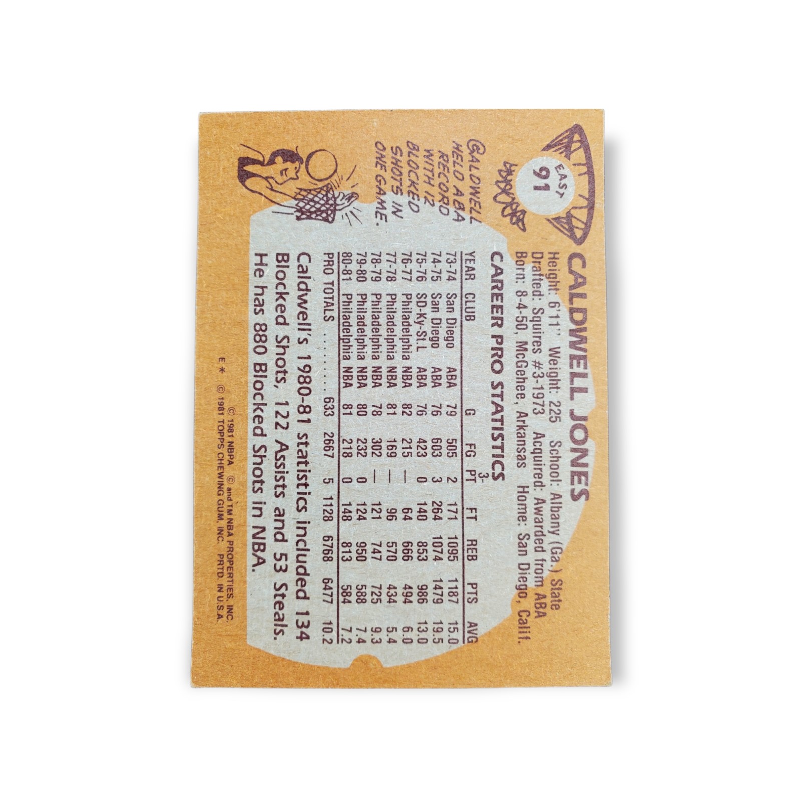 1981-82 Topps Basketball Caldwell Jones Card #91 Eastern Conference Philadelphia 76ers Trading Card