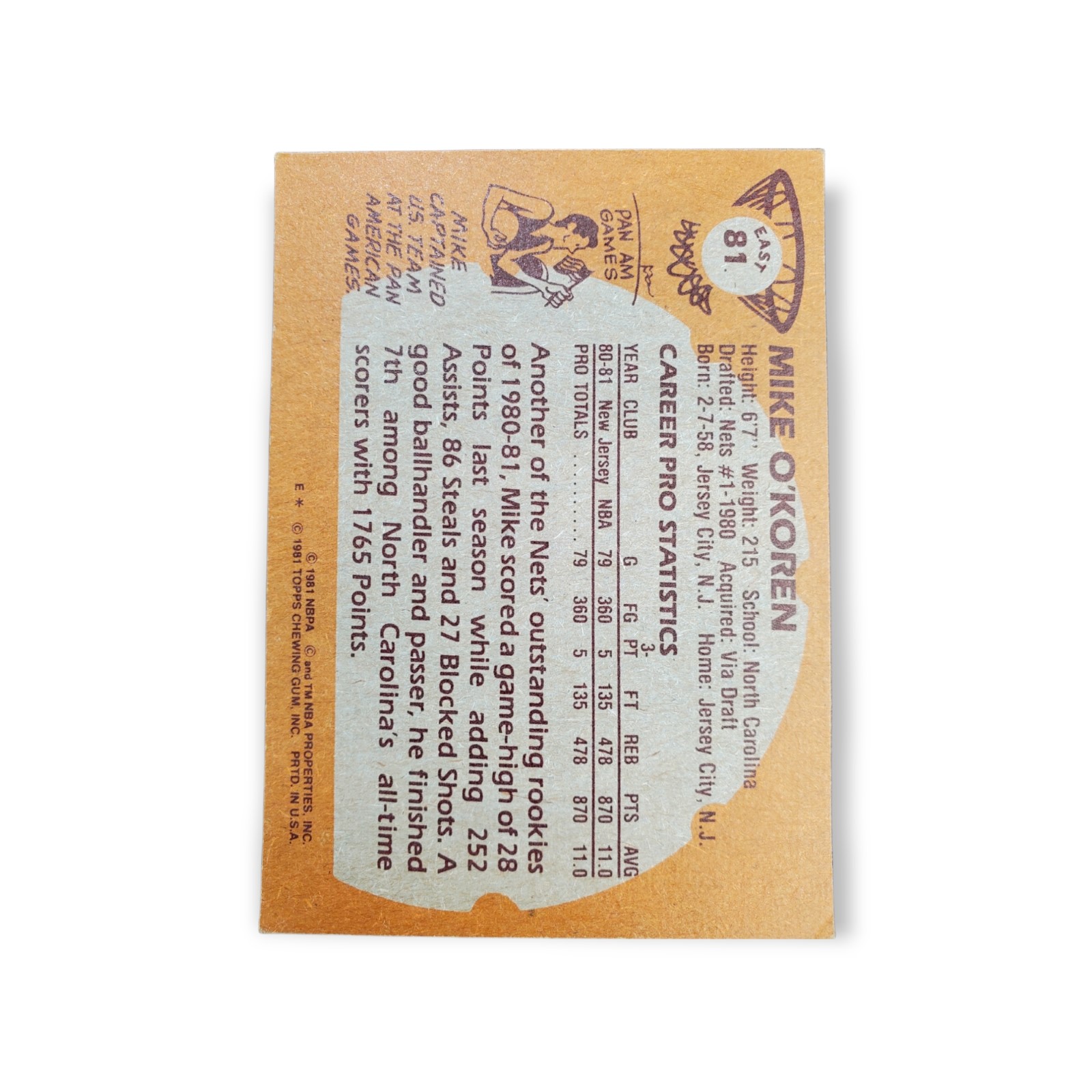 1981-82 Topps Basketball Mike O’Koren Rookie Card #81 Eastern Conference New Jersey Nets Trading Card