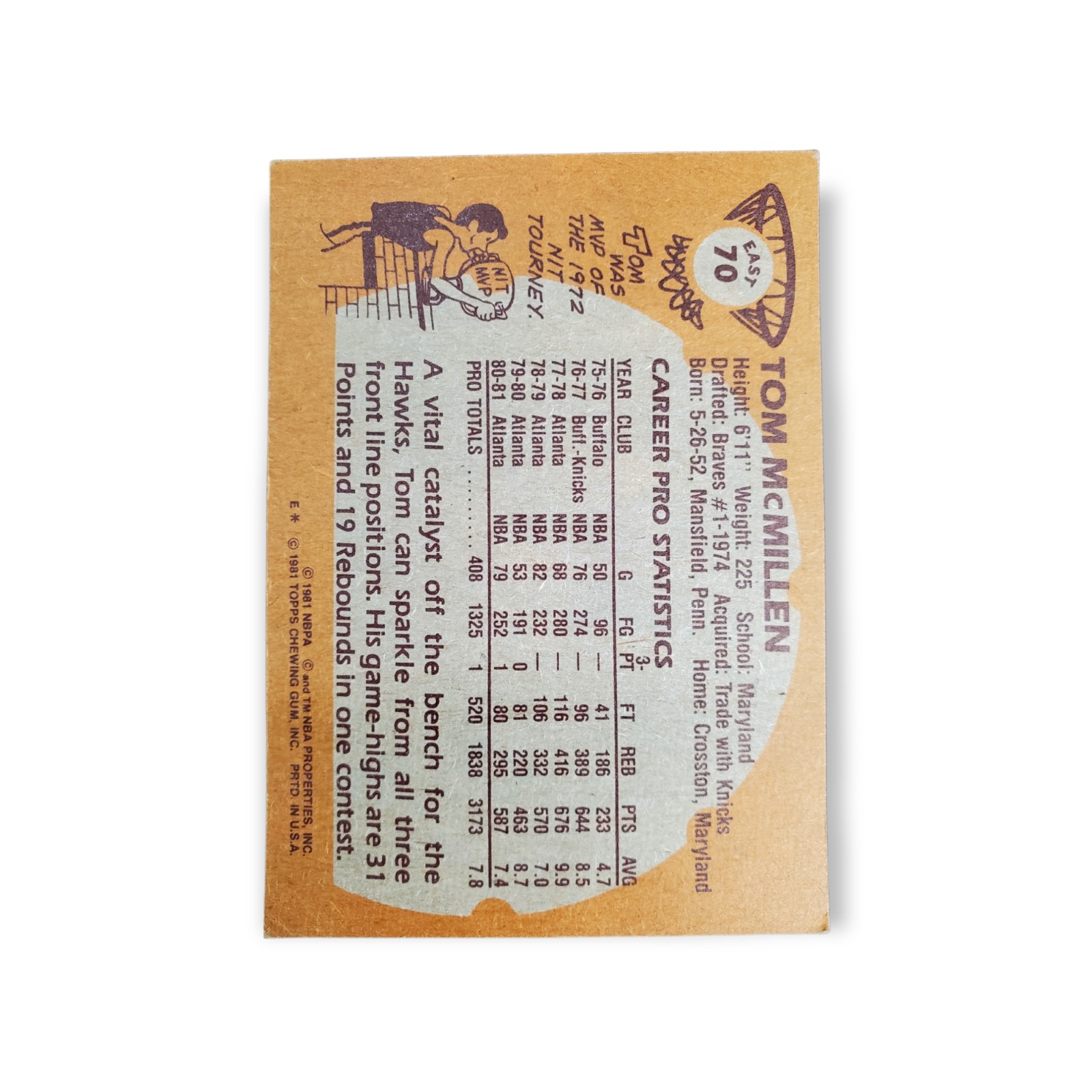 1981-82 Topps Basketball Tom McMillen Card #70 Eastern Conference Atlanta Hawks Trading Card