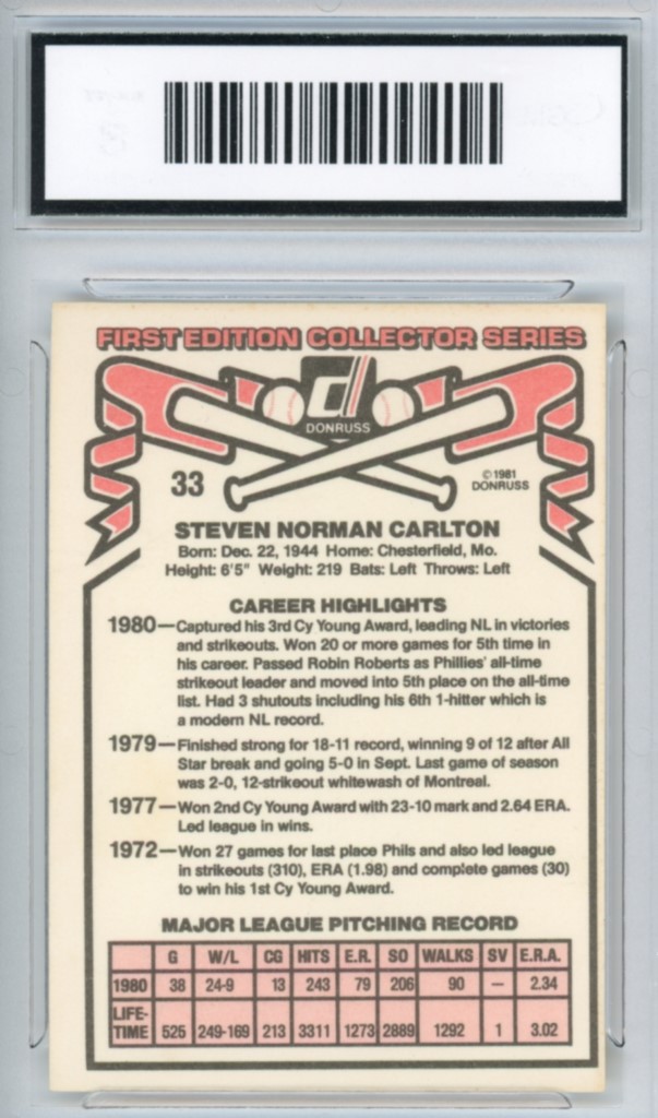 1981 Donruss Steve Carlton First Edition Collector Series Philadelphia Phillies Baseball Card #33 – GMA Professional Graded 8 NM-MT