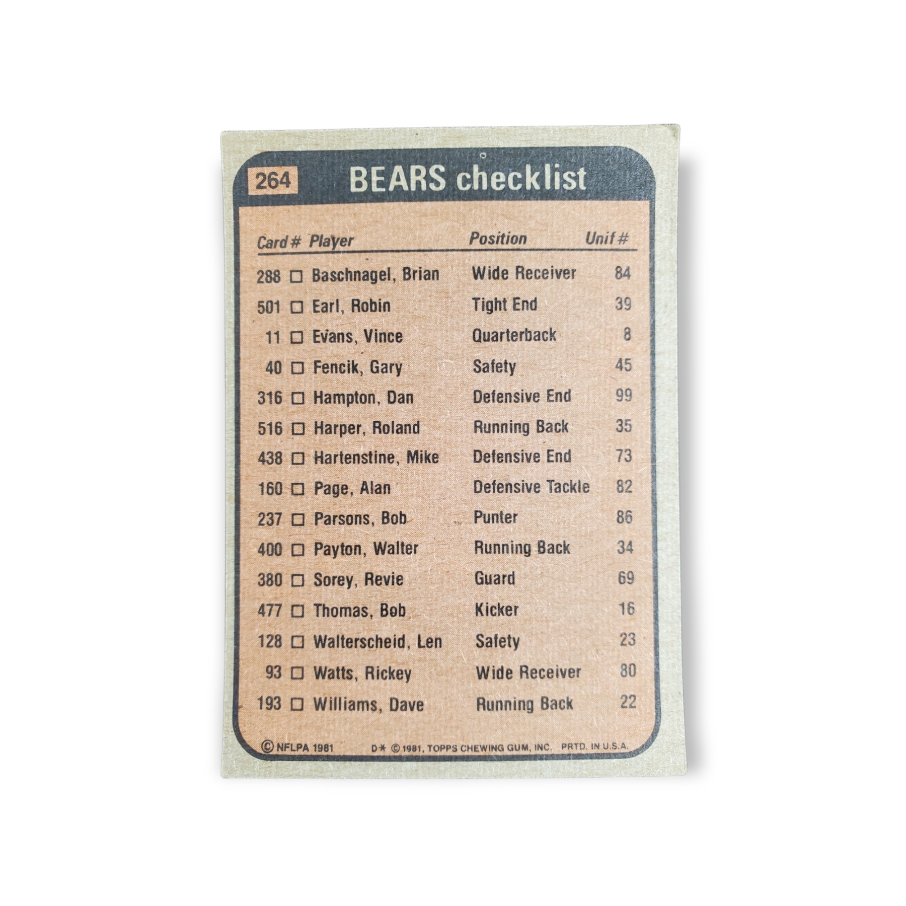 1981 Topps Football Bears Team Checklist #264 Walter Payton / Scott / Hampton