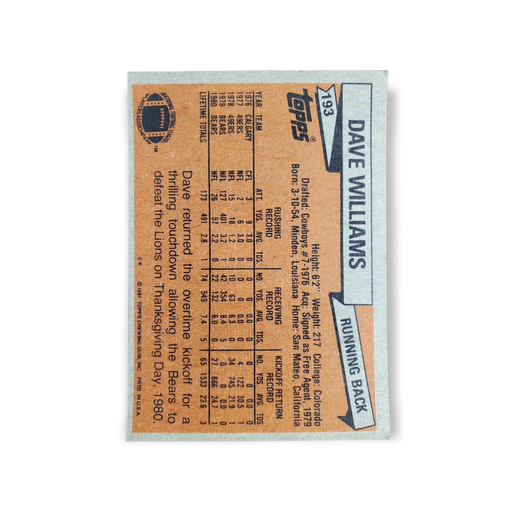 1981 Topps Football Dave Williams Rookie Card #193 Chicago Bears Trading Card