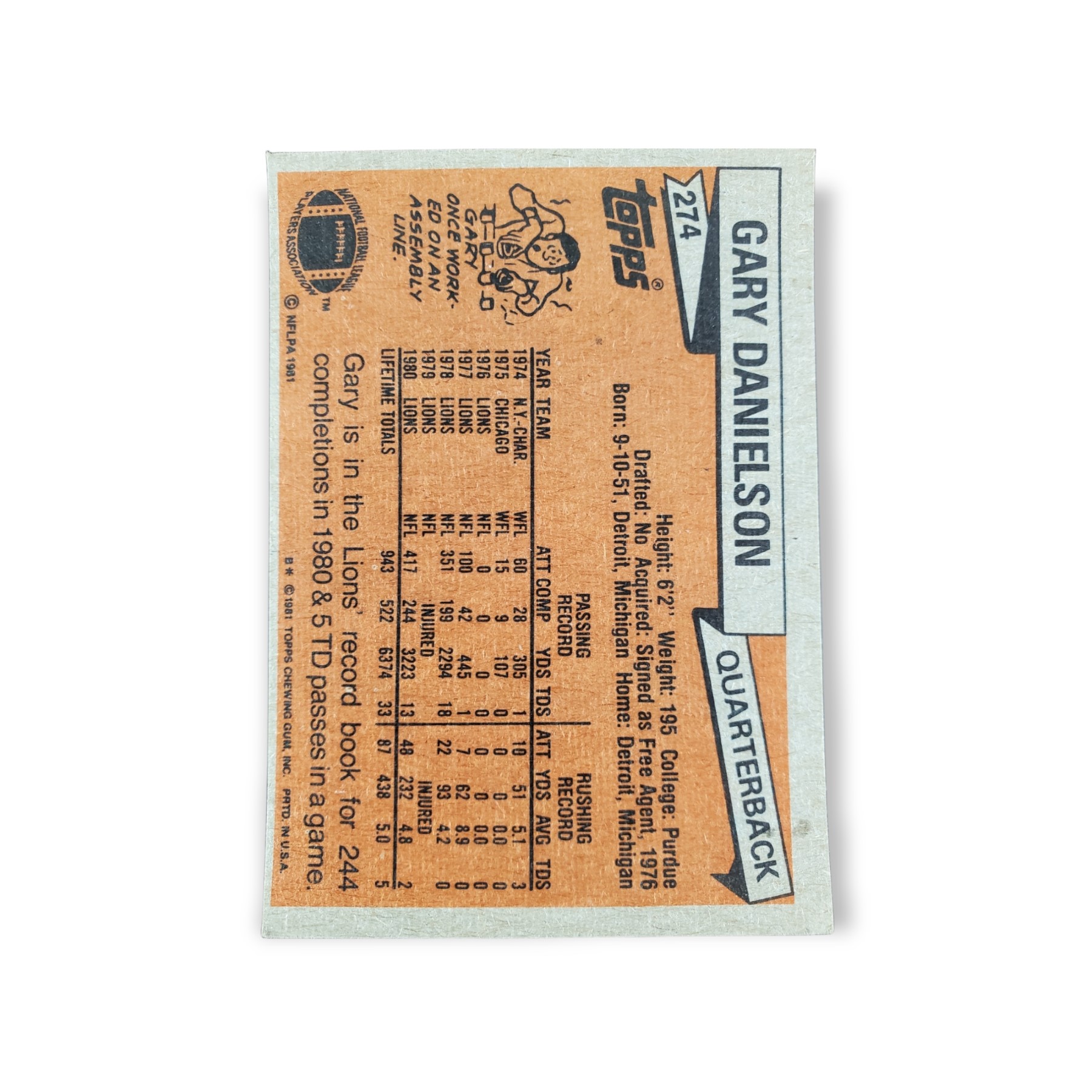 1981 Topps Football Gary Danielson Card #274 Detroit Lions Trading Card