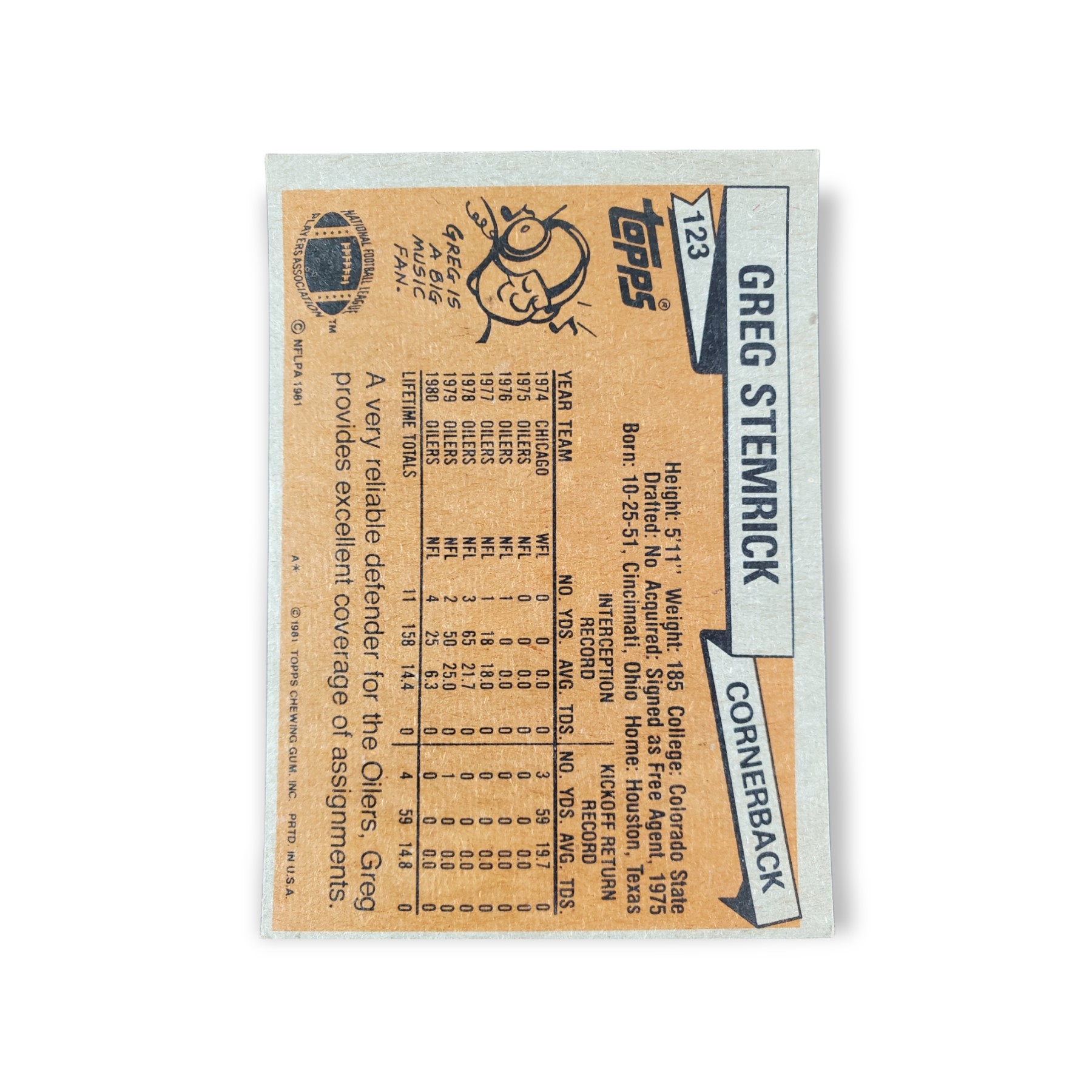 1981 Topps Football Greg Stemrick Rookie Card #123 Houston Oilers Trading Card