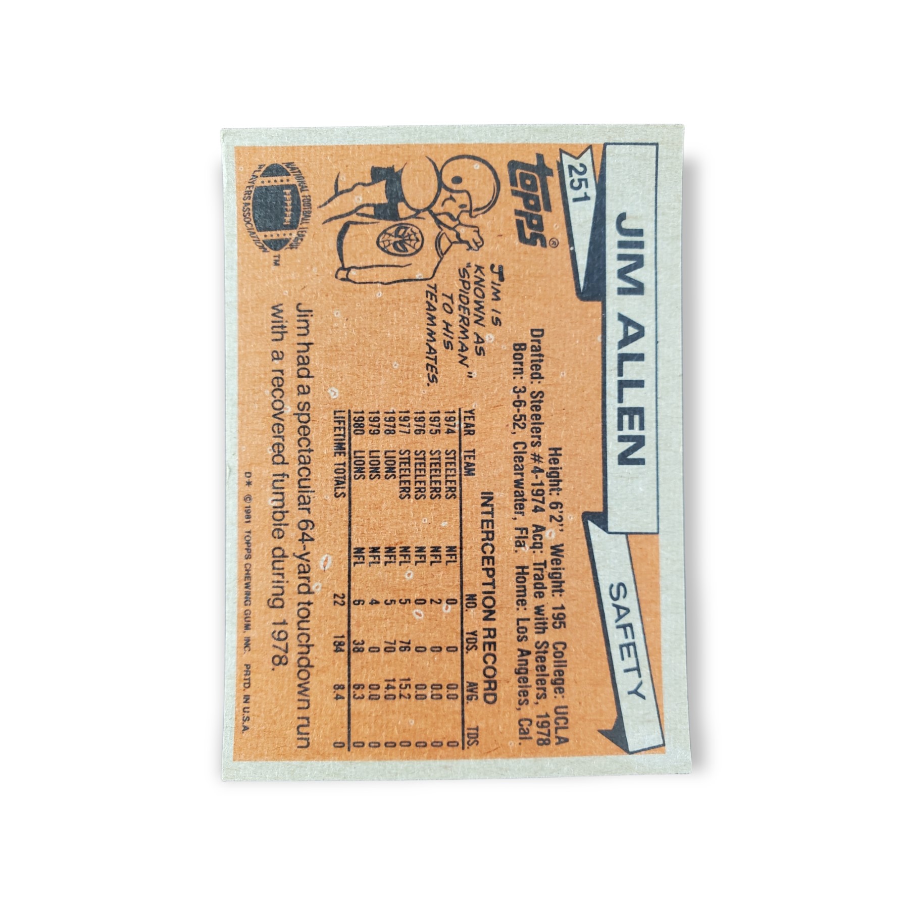 1981 Topps Football Jim Allen Card #251 Detroit Lions Trading Card