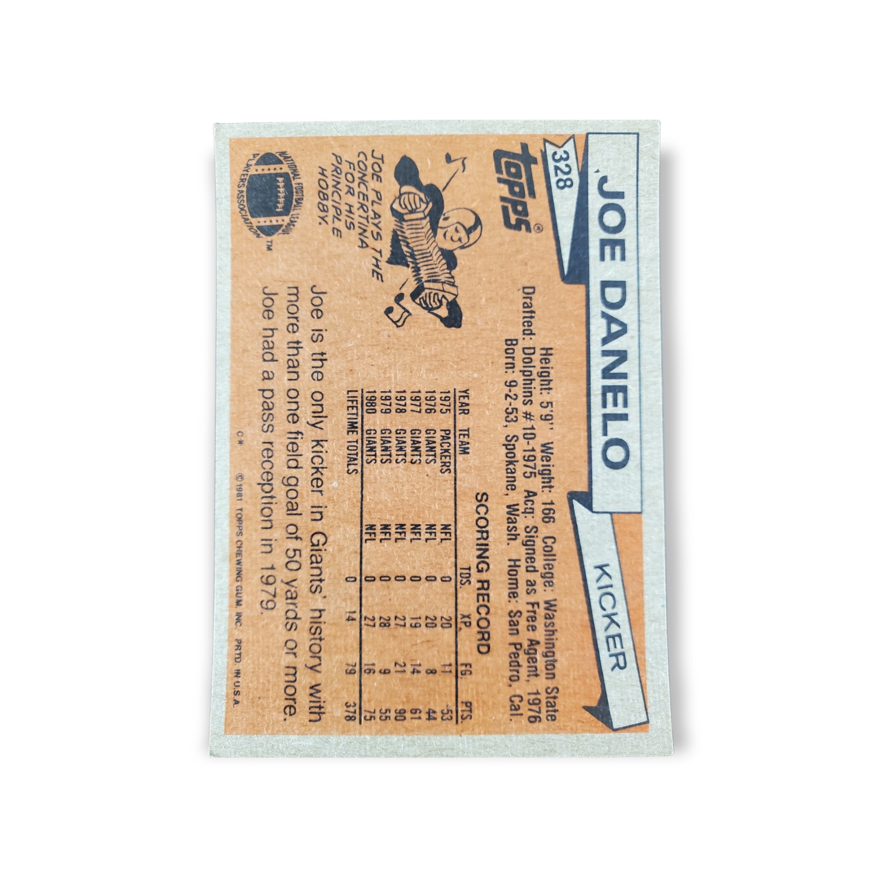 1981 Topps Football Joe Danelo Card #328 New York Giants Trading Card