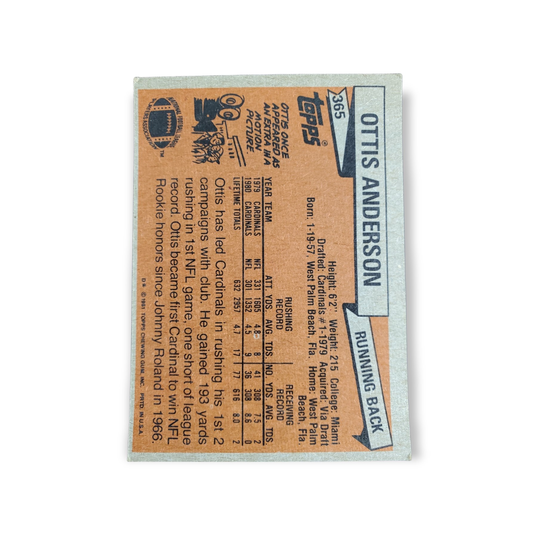 1981 Topps Football Ottis Anderson Card #365 St. Louis Cardinals Trading Card