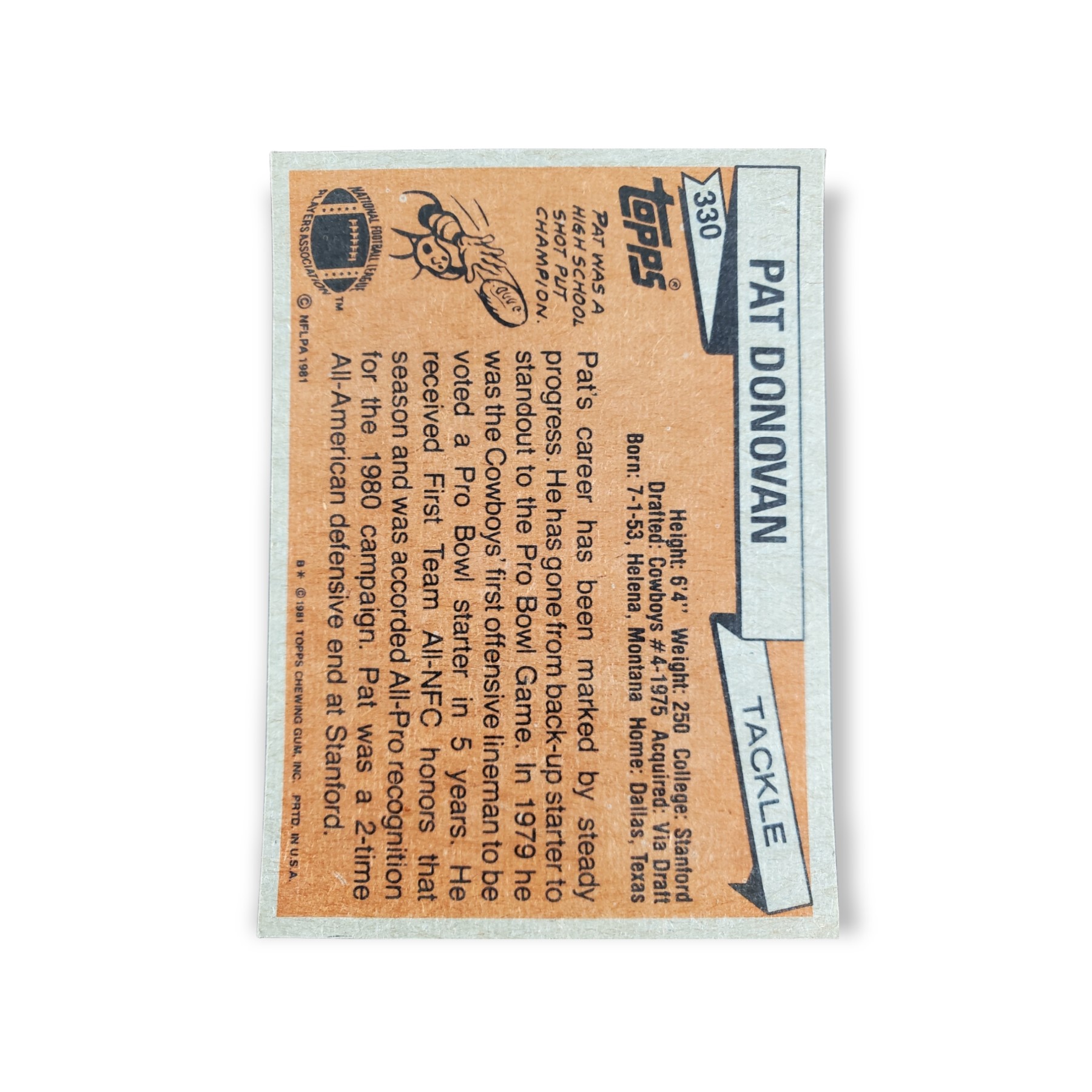 1981 Topps Football Pat Donovan Card #330 All-Pro Dallas Cowboys Trading Card