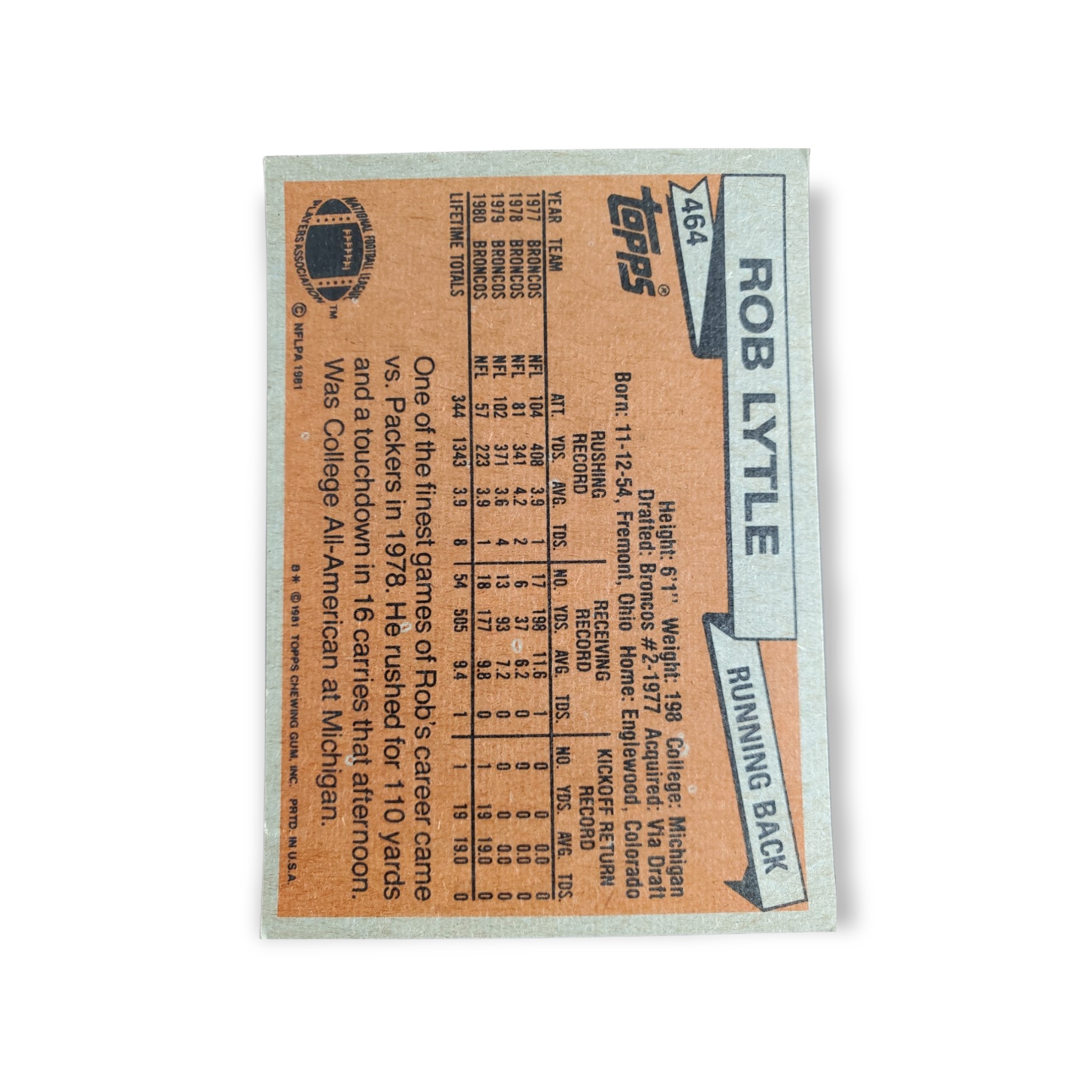 1981 Topps Football Rob Lytle Card #464 Denver Broncos Trading Card