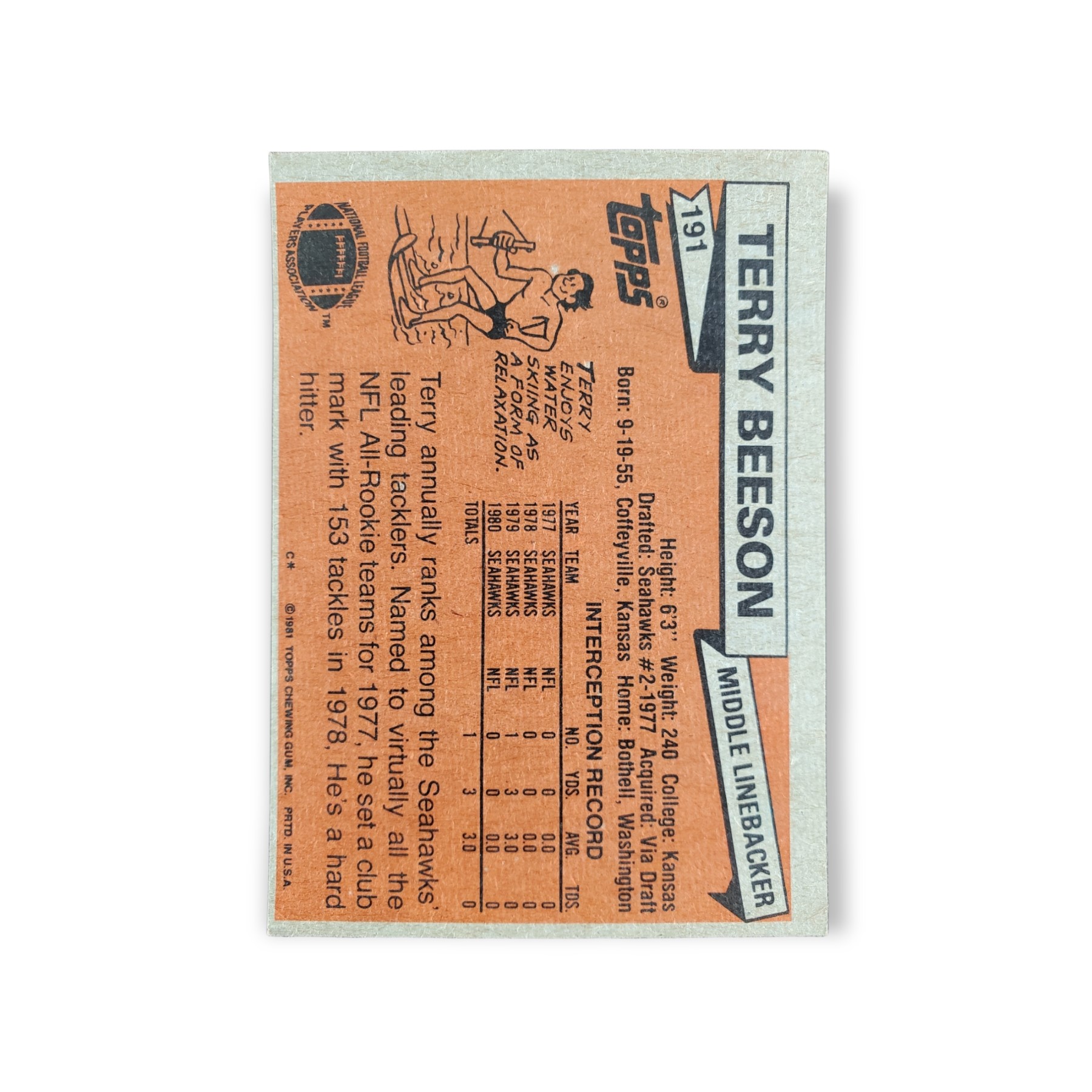 1981 Topps Football Terry Beeson Card #191 Seattle Seahawks Trading Card