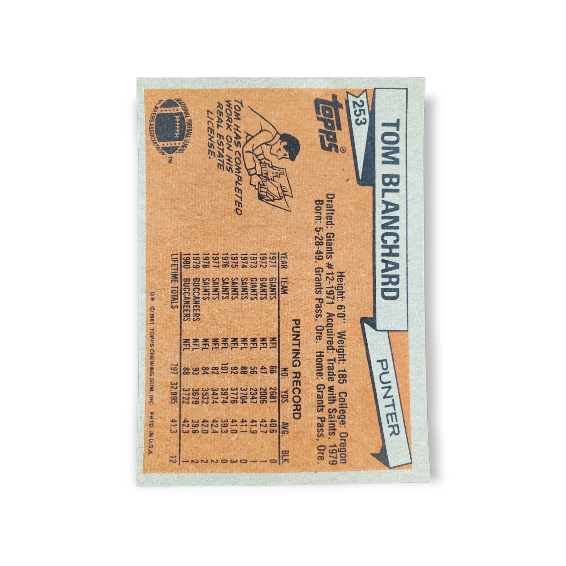 1981 Topps Football Tom Blanchard Card #253 Tampa Bay Buccaneers Trading Card