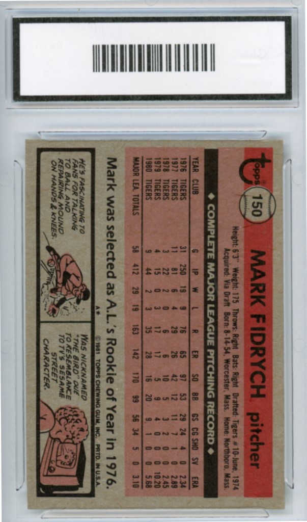 1981 Topps Mark Fidrych Detroit Tigers Baseball Card #150 – GMA Professional Graded 8.5 NM-MT+
