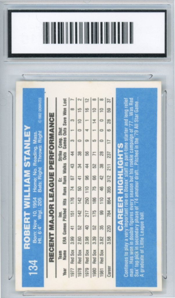 1982 Donruss Bob Stanley Boston Red Sox Baseball Card #134 – GMA Professional Graded 10 Gem MT