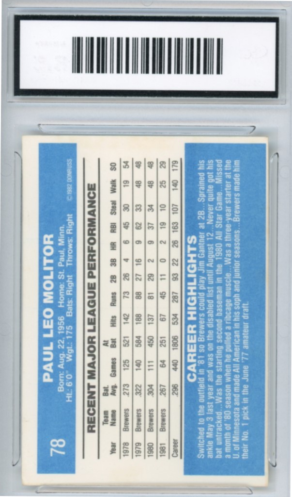 1982 Donruss Paul Molitor Milwaukee Brewers Baseball Card #78 – GMA Professional Graded 7 NM