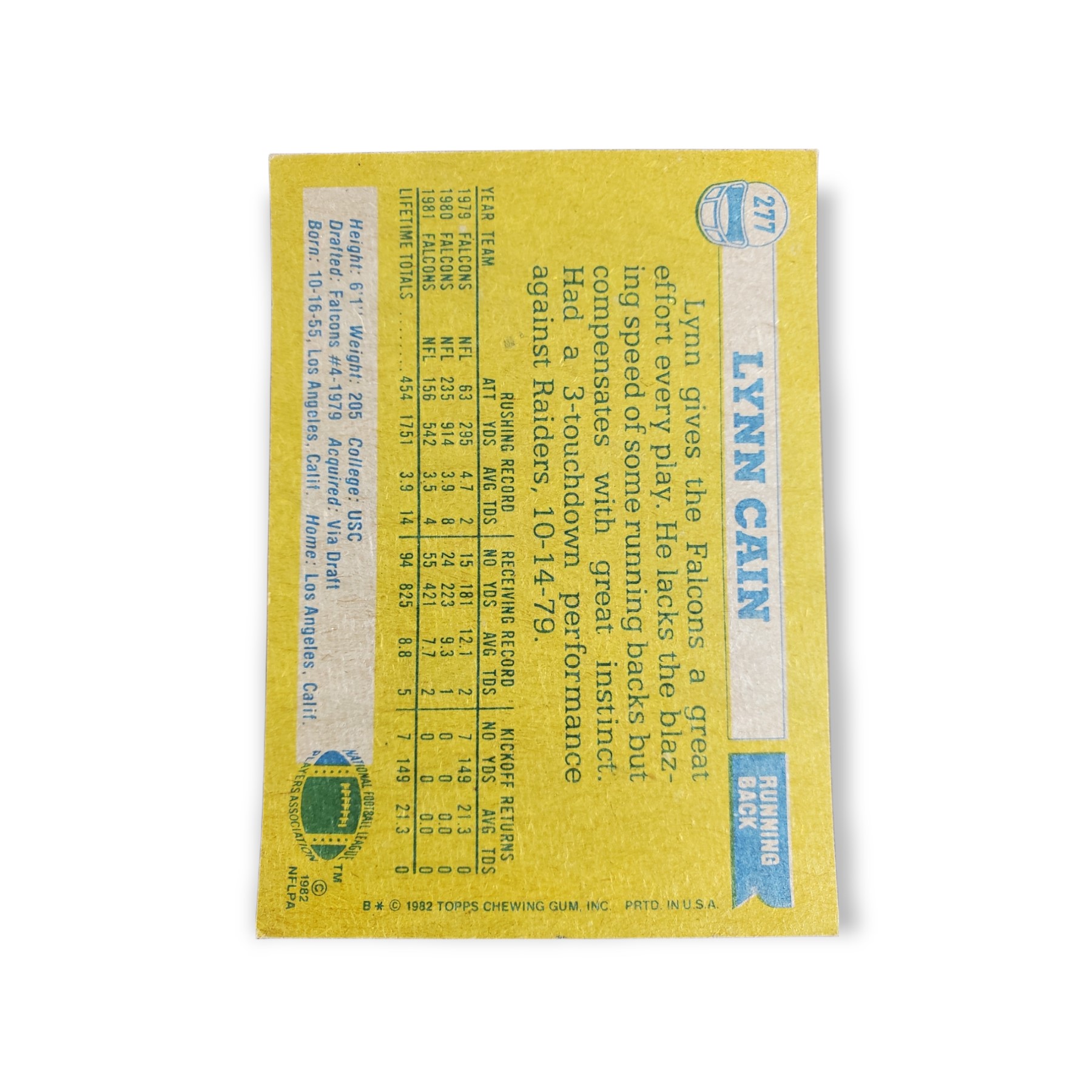 1982 Topps Football Lynn Cain Card #277 Atlanta Falcons Trading Card