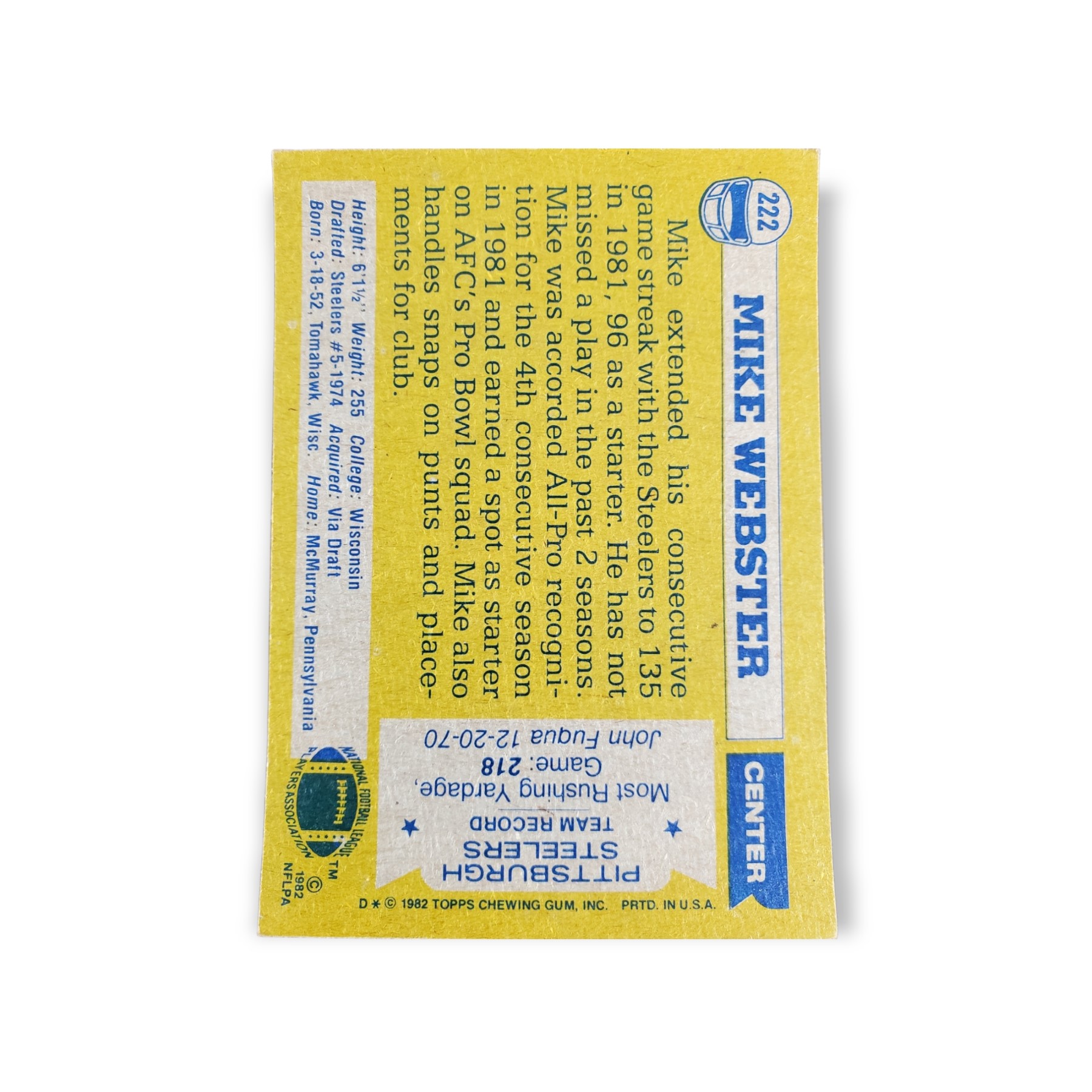 1982 Topps Football Mike Webster Card #222 All-Pro Pittsburgh Steelers Trading Card