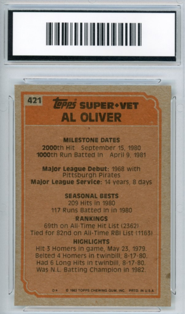 1983 Topps Al Oliver Super Veteran Montreal Expos Baseball Card #421 – GMA Professional Graded 9 Mint