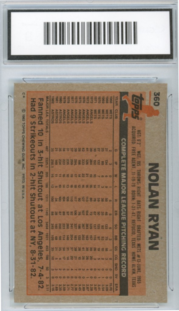 1983 Topps Nolan Ryan Houston Astros Baseball Card #360 – GMA Professional Graded 9 Mint