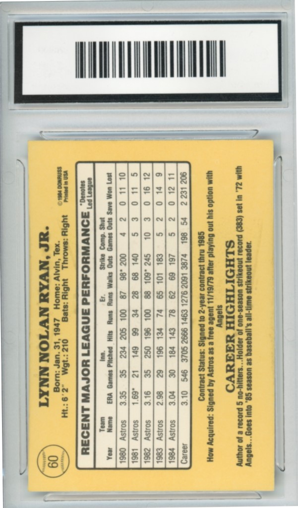 1985 Donruss Nolan Ryan Houston Astros Baseball Card #60 – GMA Professional Graded 8 NM-MT