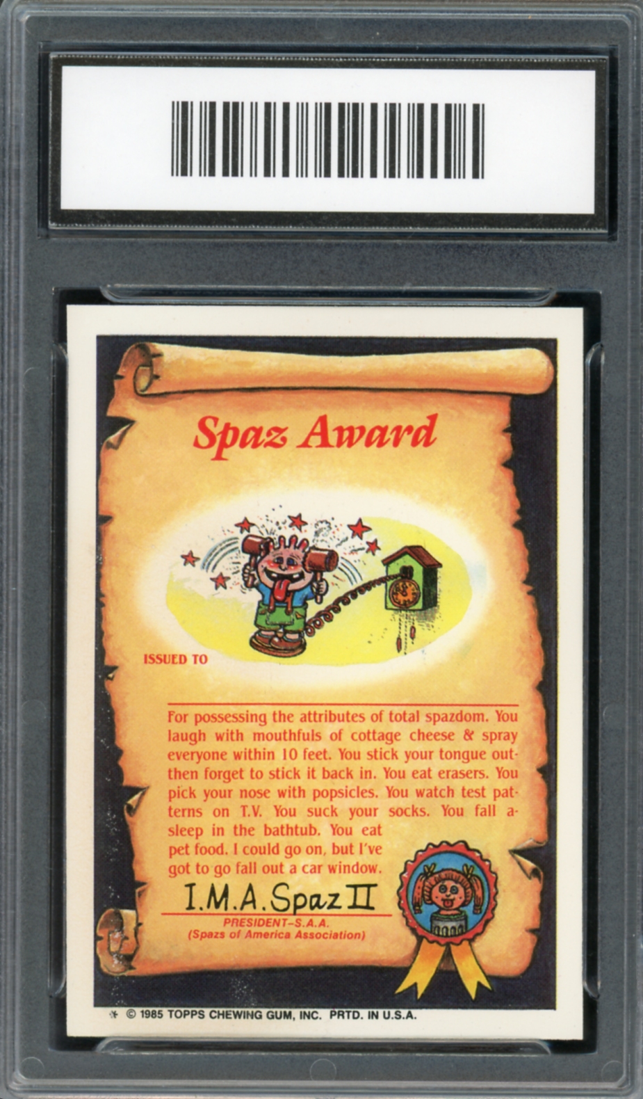 The 1985 Topps Garbage Pail Kids Original Series 2 set has a total of 84 cards that make up a numerical set. The cards are numbered 42a-83a and 42b-83b. There were a total of three print runs for the United states Garbage Pail Kids Original Series 2. It takes a total of 131 cards to make a complete variation set. Each card measures approximately 3.5″ x 2.5″ x 1/32″ and doubles as a sticker which can be peeled off by the front of the card. The front of the card depicts one of the sets wild characters while the back of the card is reserved for a either a diploma, license, award or a puzzle piece. If you are interested in starting your own set or adding to an existing one, visit our store to pick out whichever cards you need while they’re still available!
