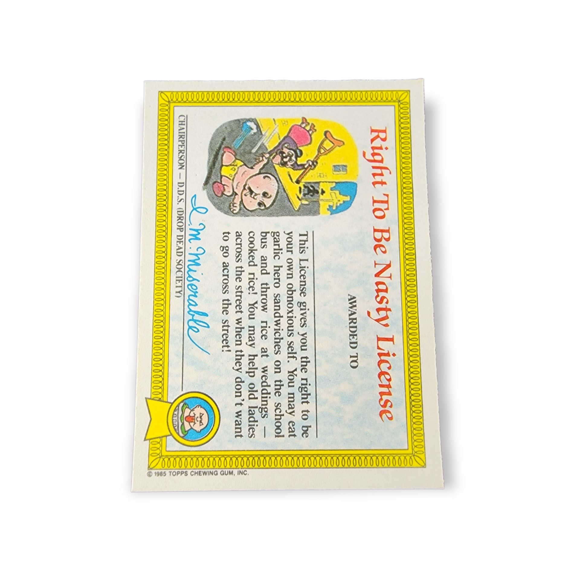 The 1985 Topps Garbage Pail Kids UK Original Series 1 set has a total of 82 cards that make up a numerical set. The cards are numbered 1a-41a and 1b-41b. There are an additional 6 variation cards for the card numbers that have both a checklist back and an award back. It takes a total of 88 cards to make a complete variation set. Each card measures approximately 3″ x 2 1/10″ x 1/32″ and doubles as a sticker which can be peeled off by the front of the card. The front of the card depicts one of the sets wild characters while the back of the card is reserved for a either a diploma, license or award. If you are interested in starting your own set or adding to an existing one, visit our store to pick out whichever cards you need while they’re still available!