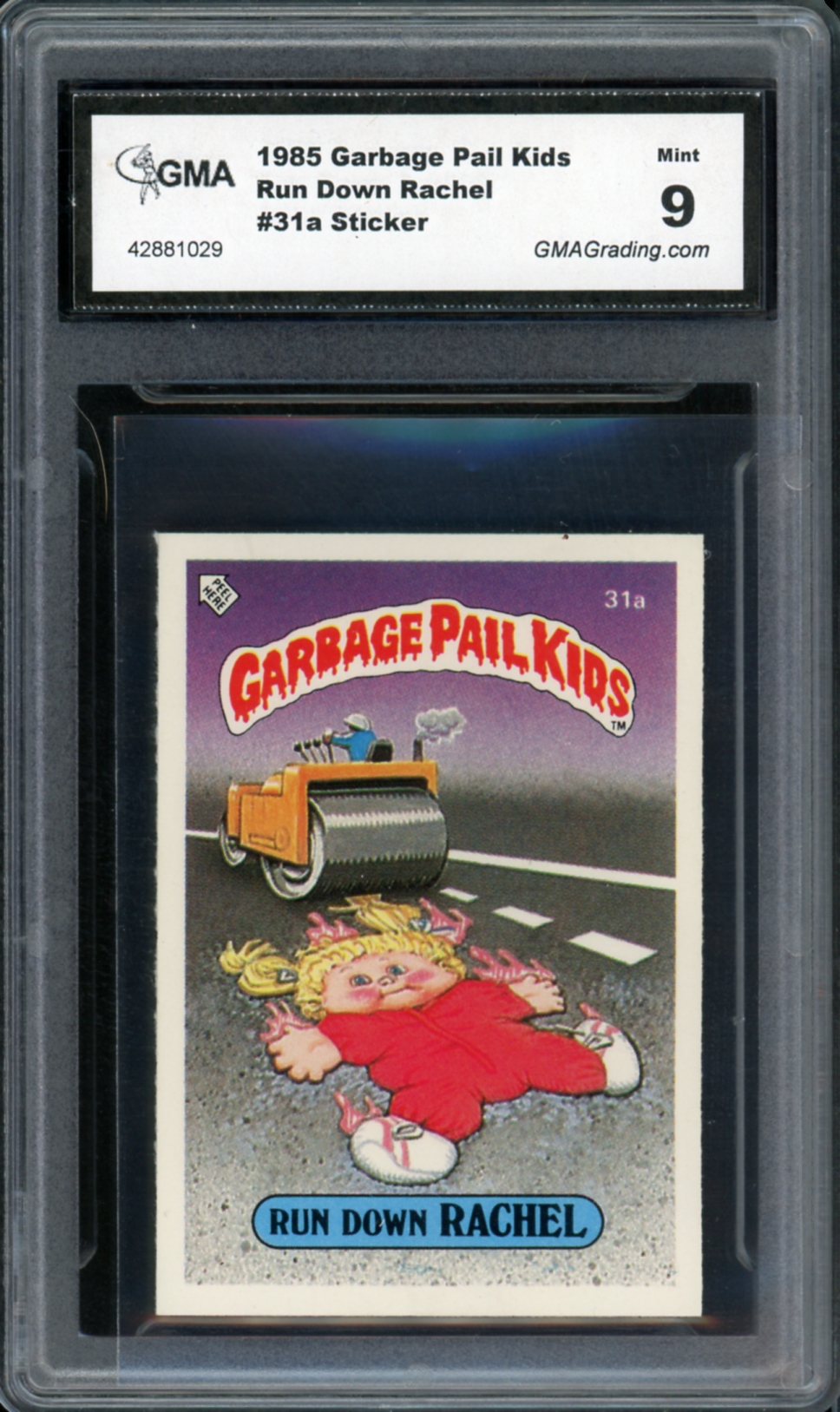 1985 Topps Garbage Pail Kids UK Series 1 #31a Run Down Rachel Sticker GMA Graded 9 Mint Non-Sport Trading Card